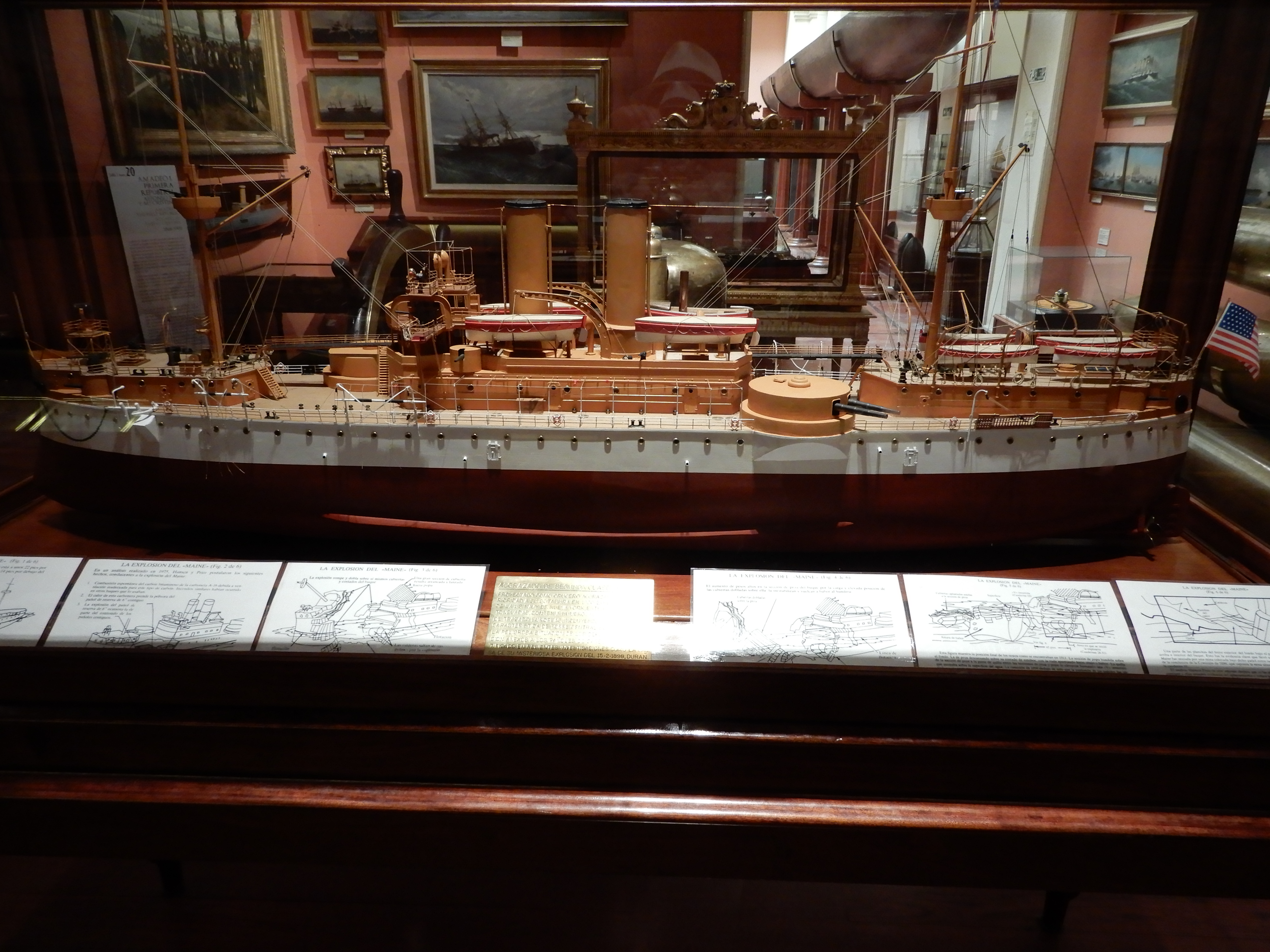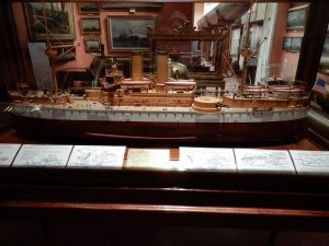 A highlight for me, was the number of models of pre-dreadnaught era ships, including even the USS Maine. These ships were steel hulled, steam powered, but with a more dispersed approach to their main battery. They were the last warships to retain what I would call “decorative elements” both internally and externally. One way to identify them is by their bow – instead of the modern sweep upward, the sweep is downward. This is a vestige of the practice of being able to ram another ship.