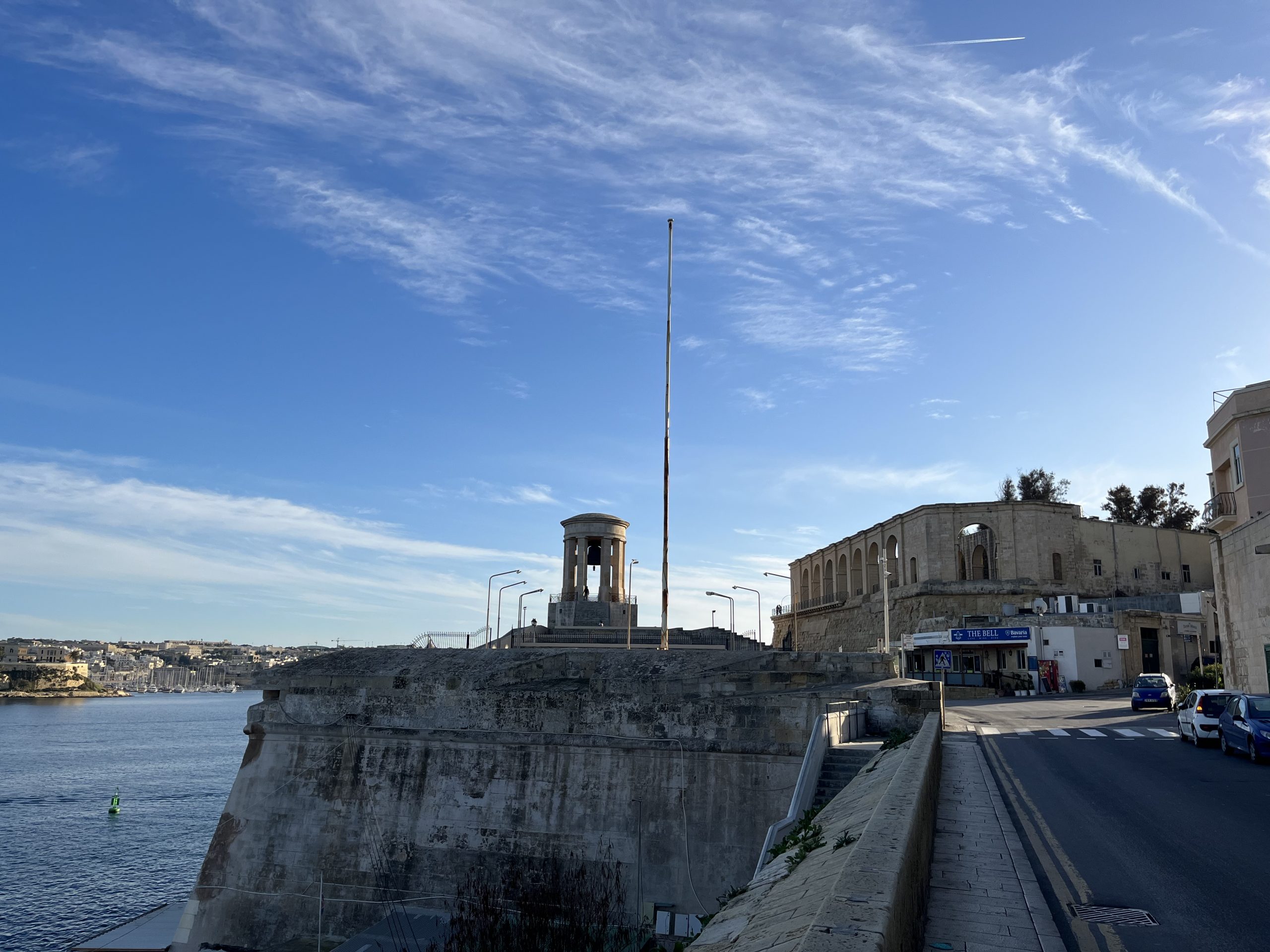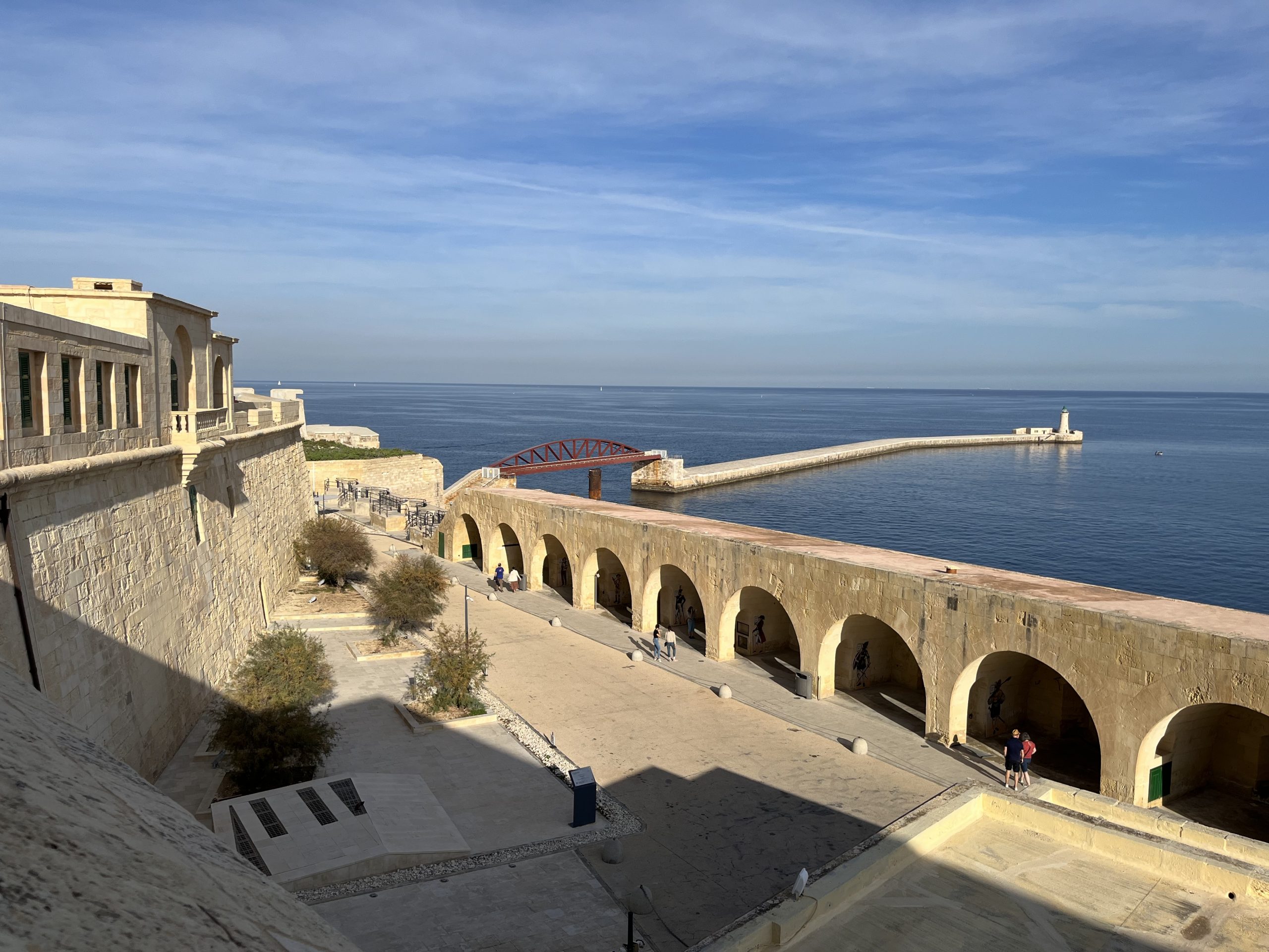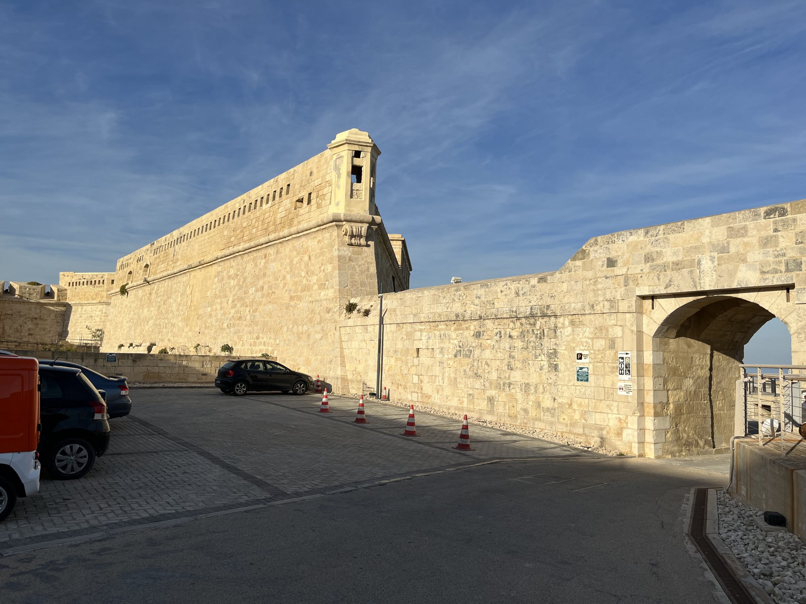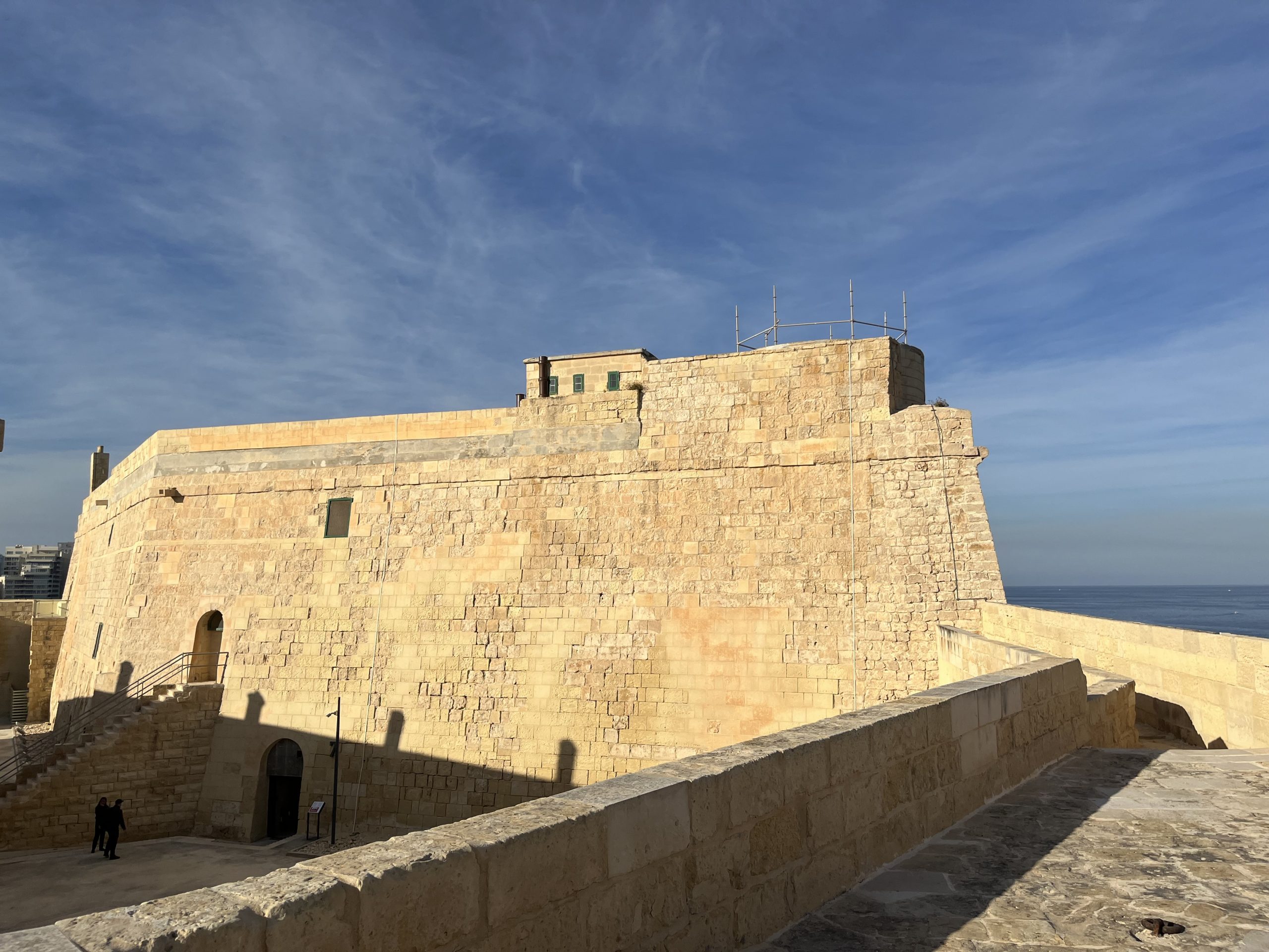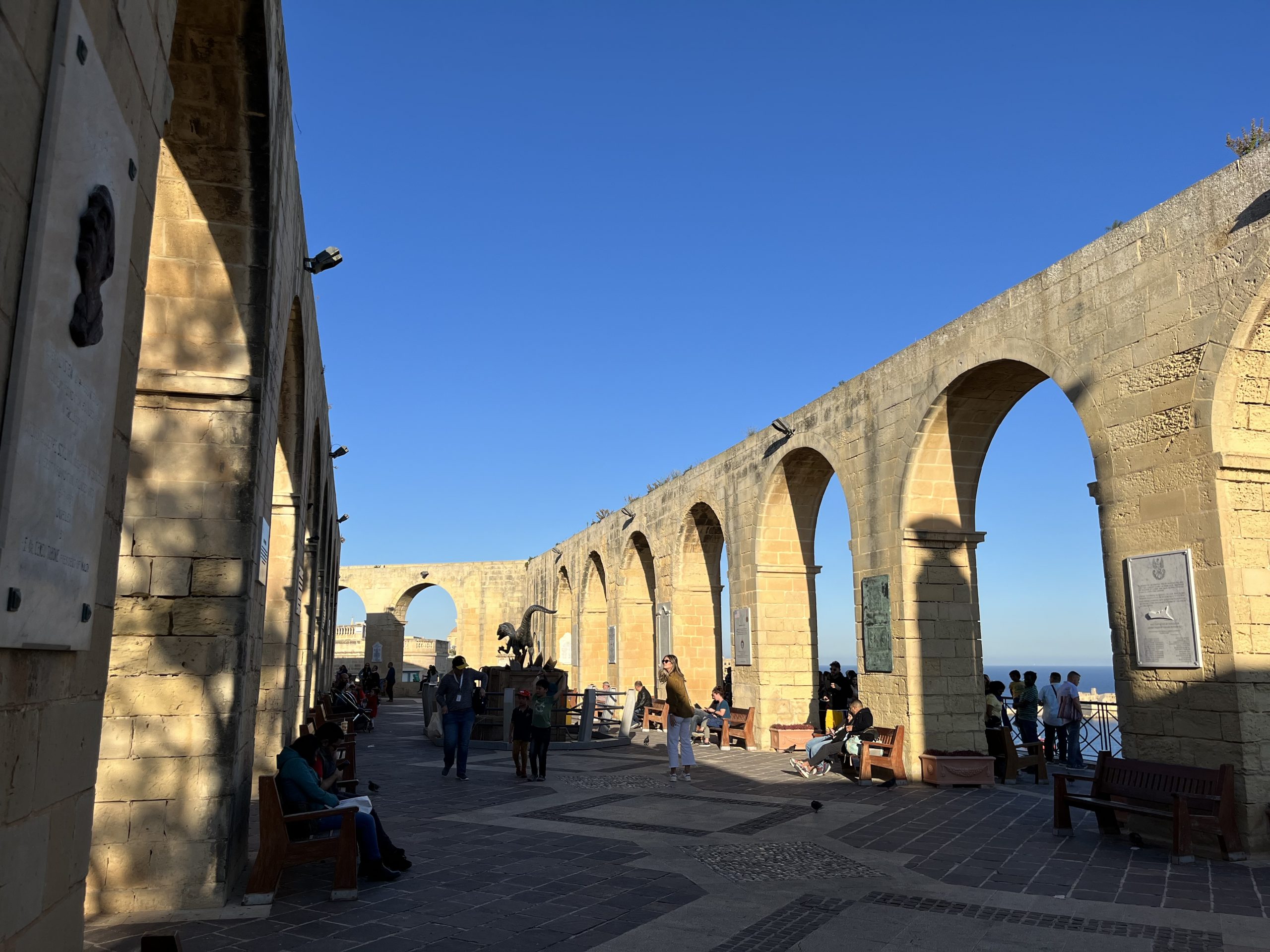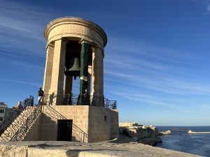 Further down the peninsula that Valletta lies on, is the Lower Barrakka Gardens. This location includes the Siege Bell War Memorial which commemorates the Maltese defense of the island during World War II that resulted in Malta being awarded the George Cross. Continuing down to the end of the peninsula one arrives at Fort St Elmo – see the gallery for photos of the extensive fortifications as well as views from the ramparts.