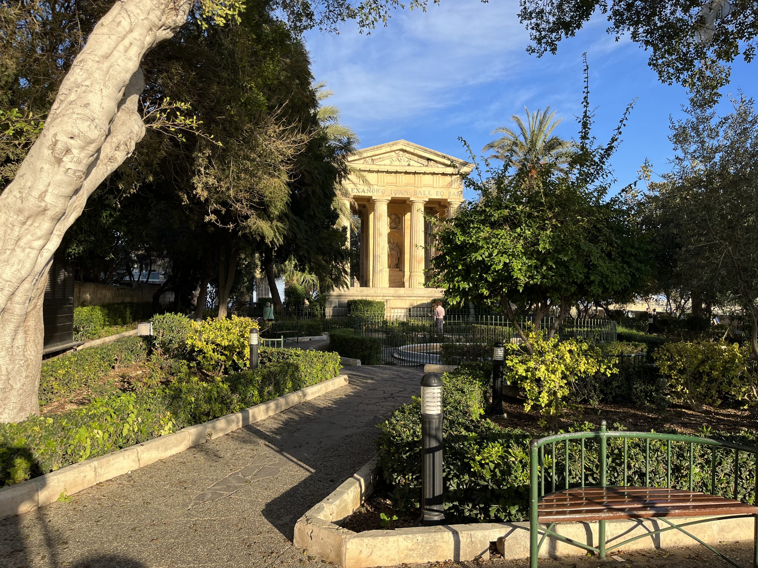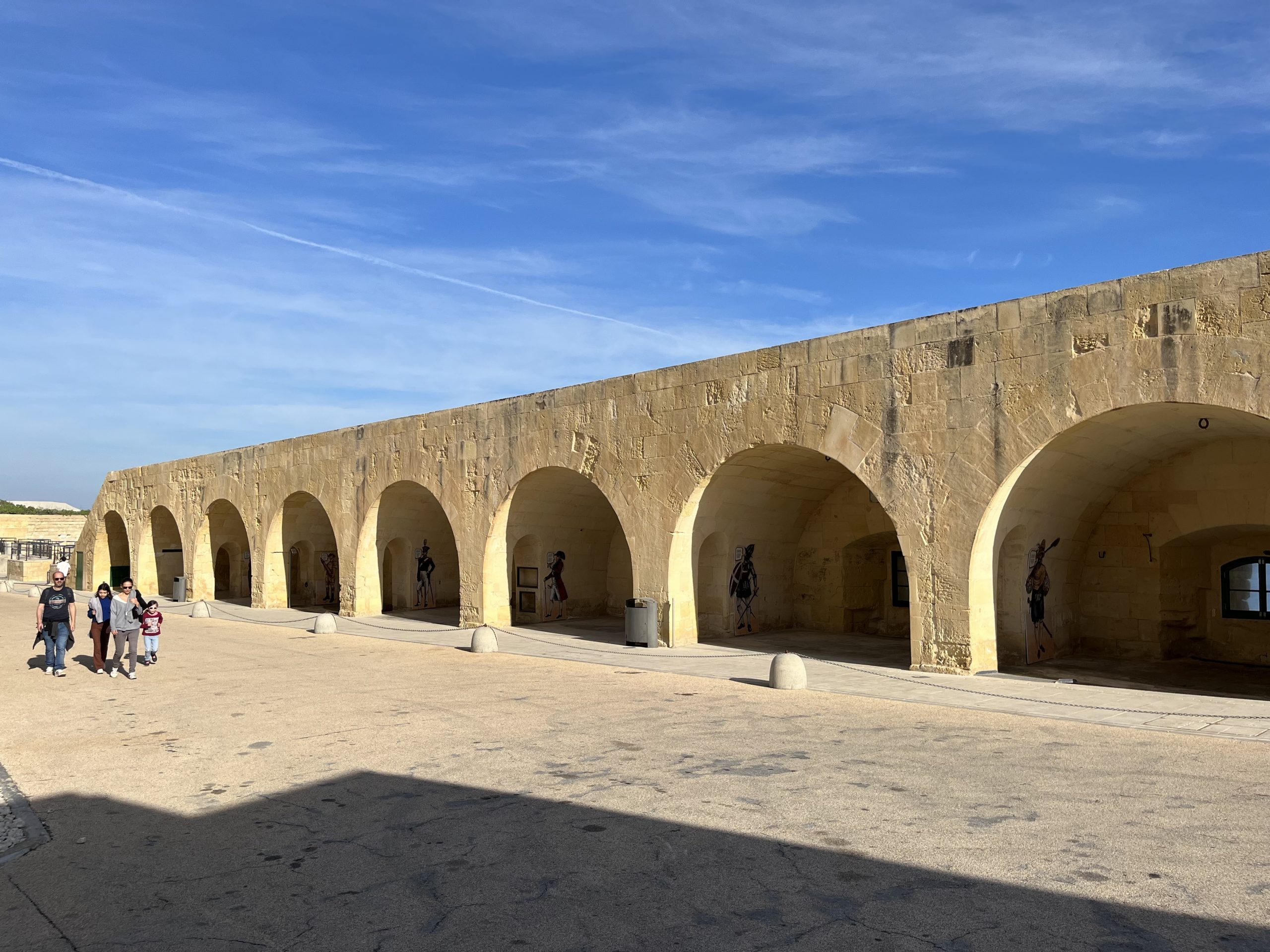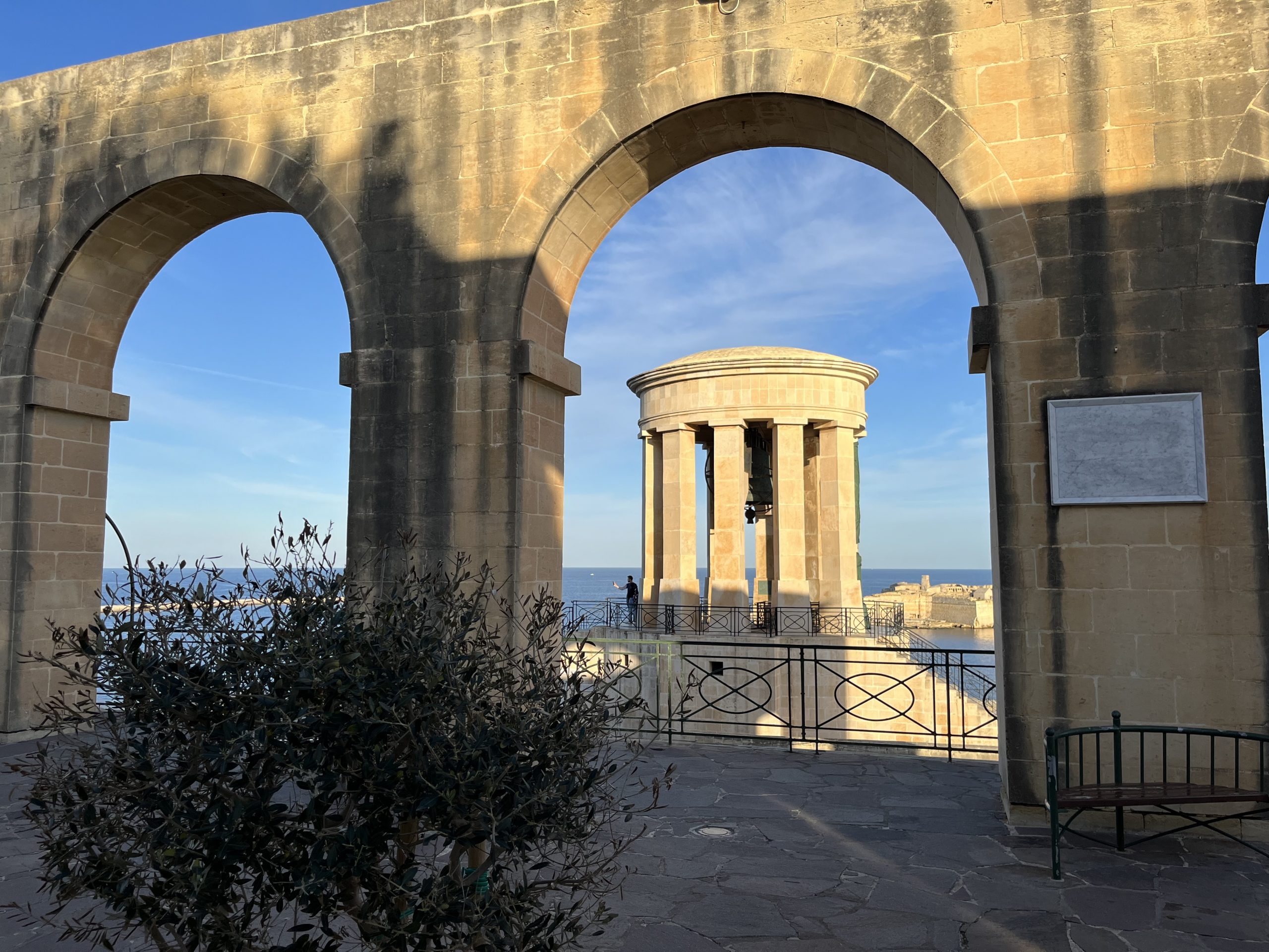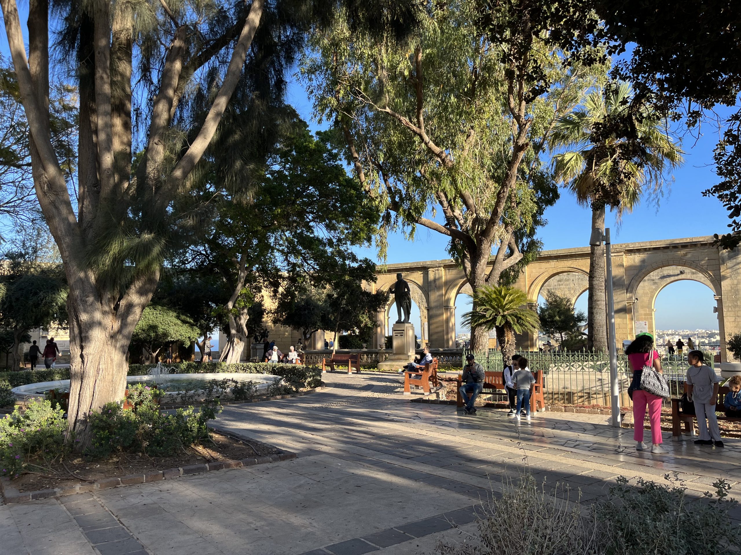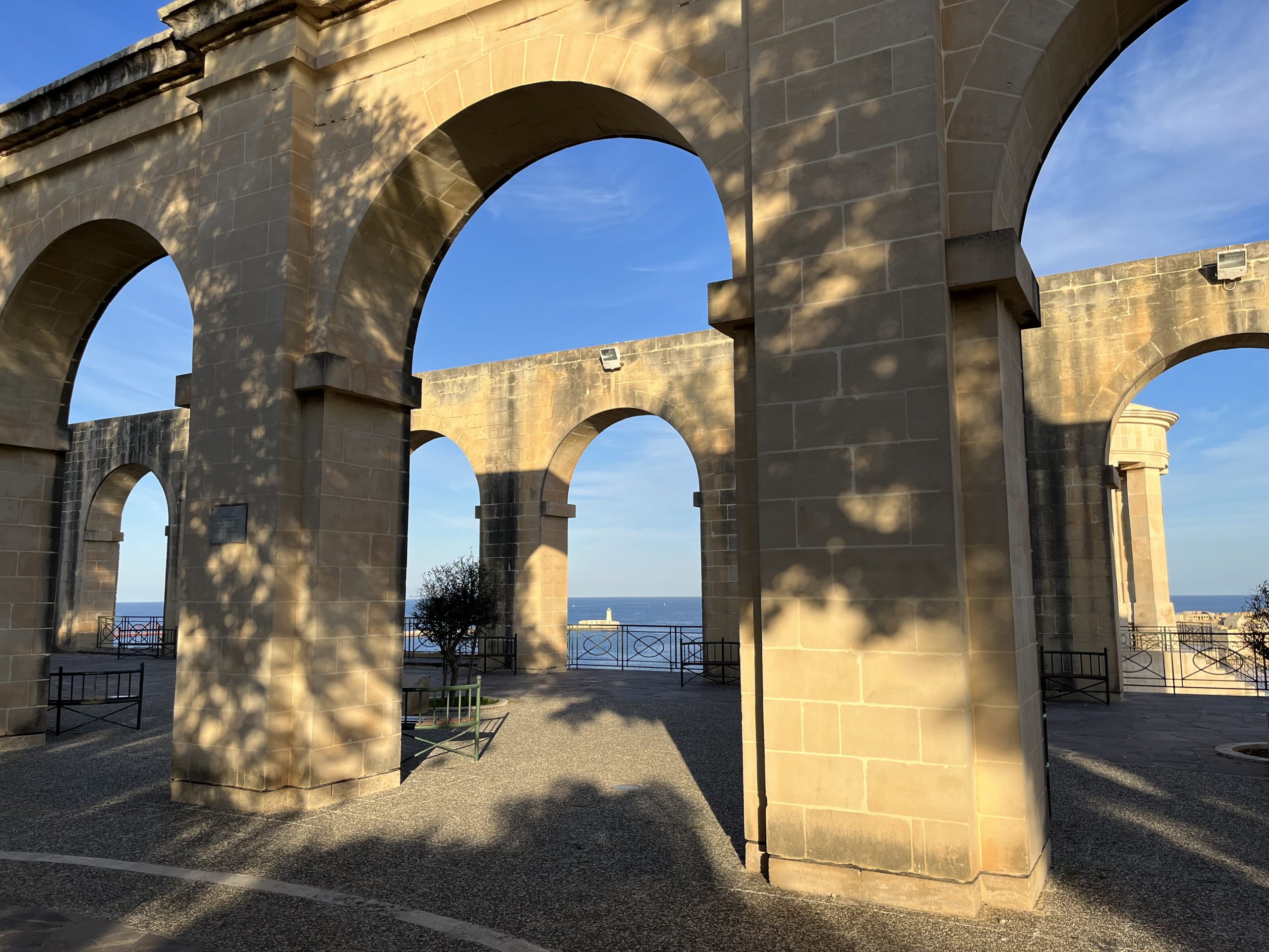 Further down the peninsula that Valletta lies on, is the Lower Barrakka Gardens. This location includes the Siege Bell War Memorial which commemorates the Maltese defense of the island during World War II that resulted in Malta being awarded the George Cross. Continuing down to the end of the peninsula one arrives at Fort St Elmo – see the gallery for photos of the extensive fortifications as well as views from the ramparts.