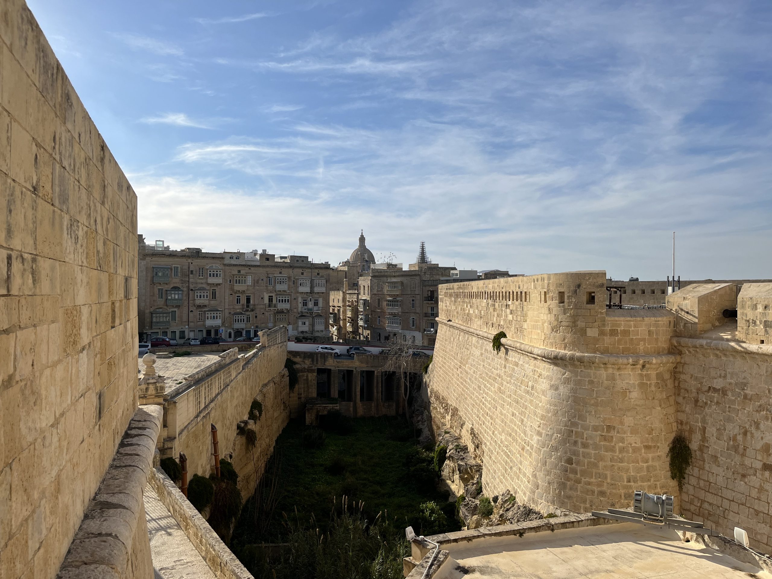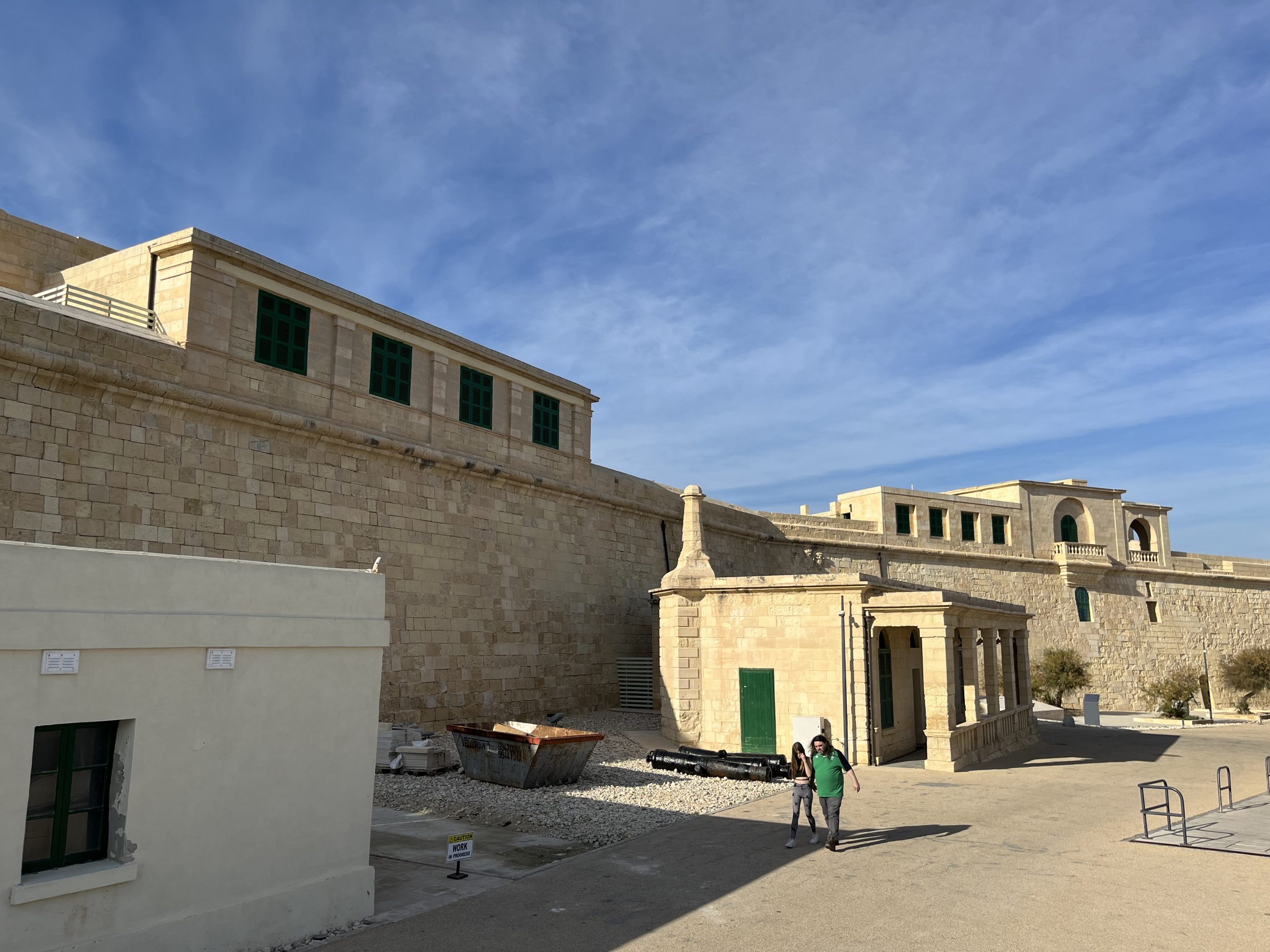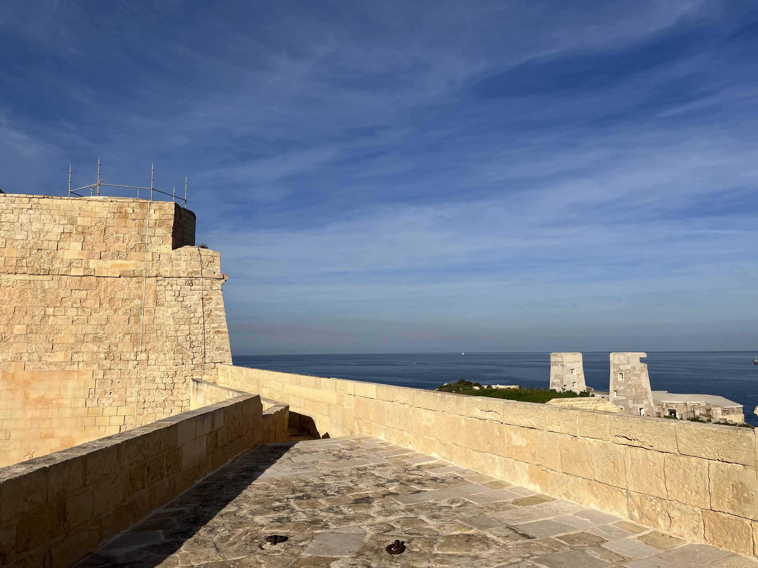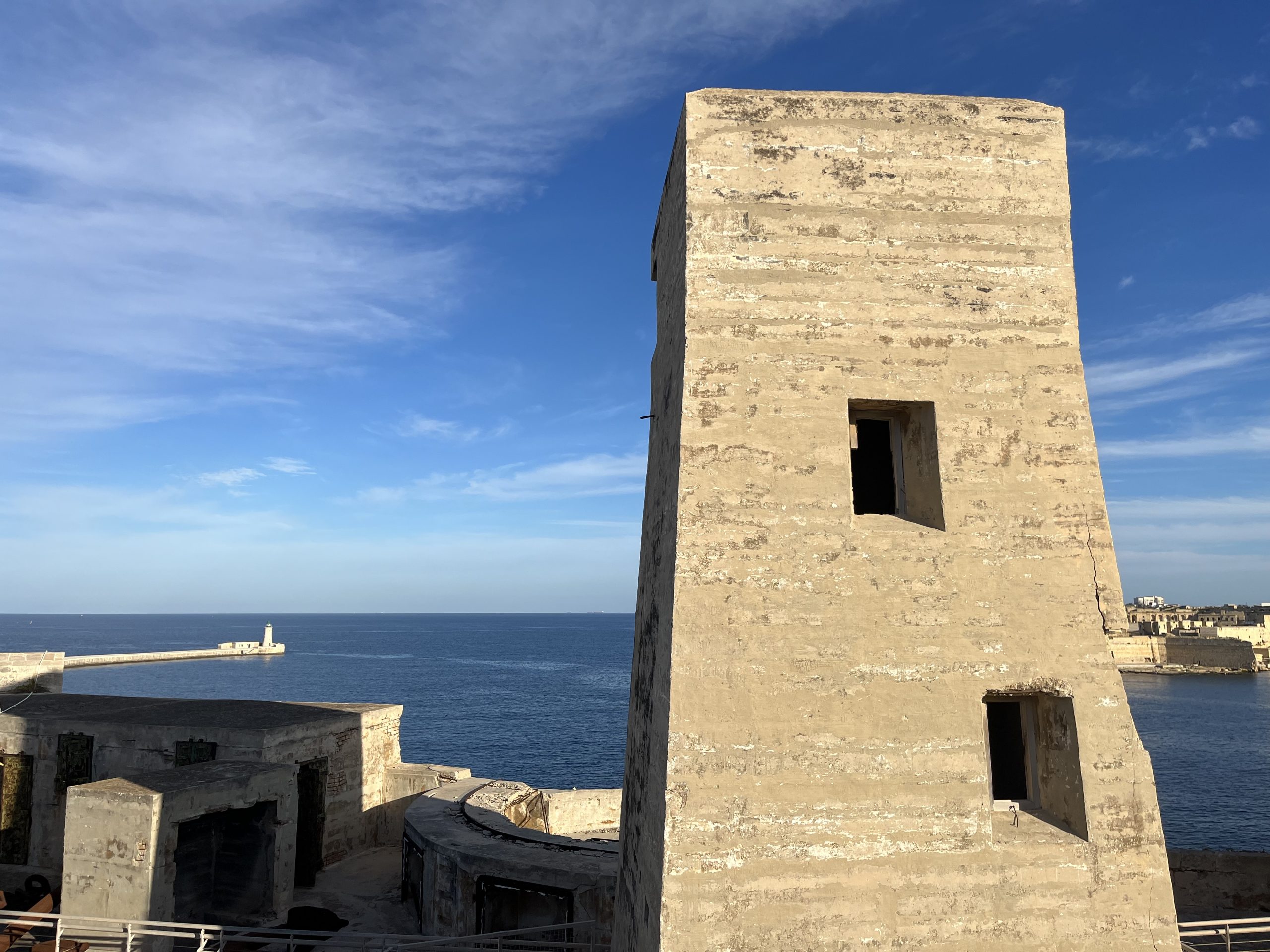 Further down the peninsula that Valletta lies on, is the Lower Barrakka Gardens. This location includes the Siege Bell War Memorial which commemorates the Maltese defense of the island during World War II that resulted in Malta being awarded the George Cross. Continuing down to the end of the peninsula one arrives at Fort St Elmo – see the gallery for photos of the extensive fortifications as well as views from the ramparts.