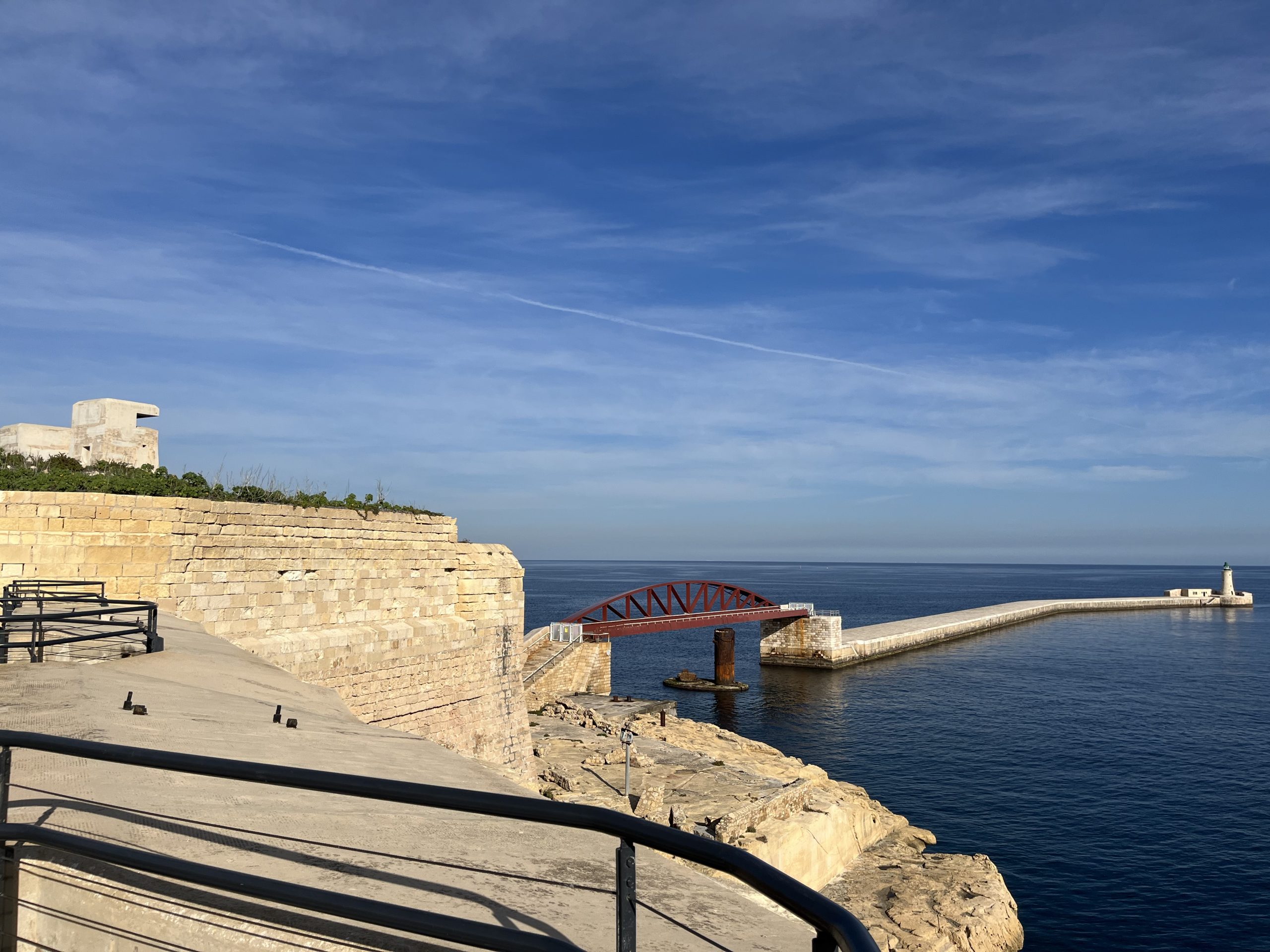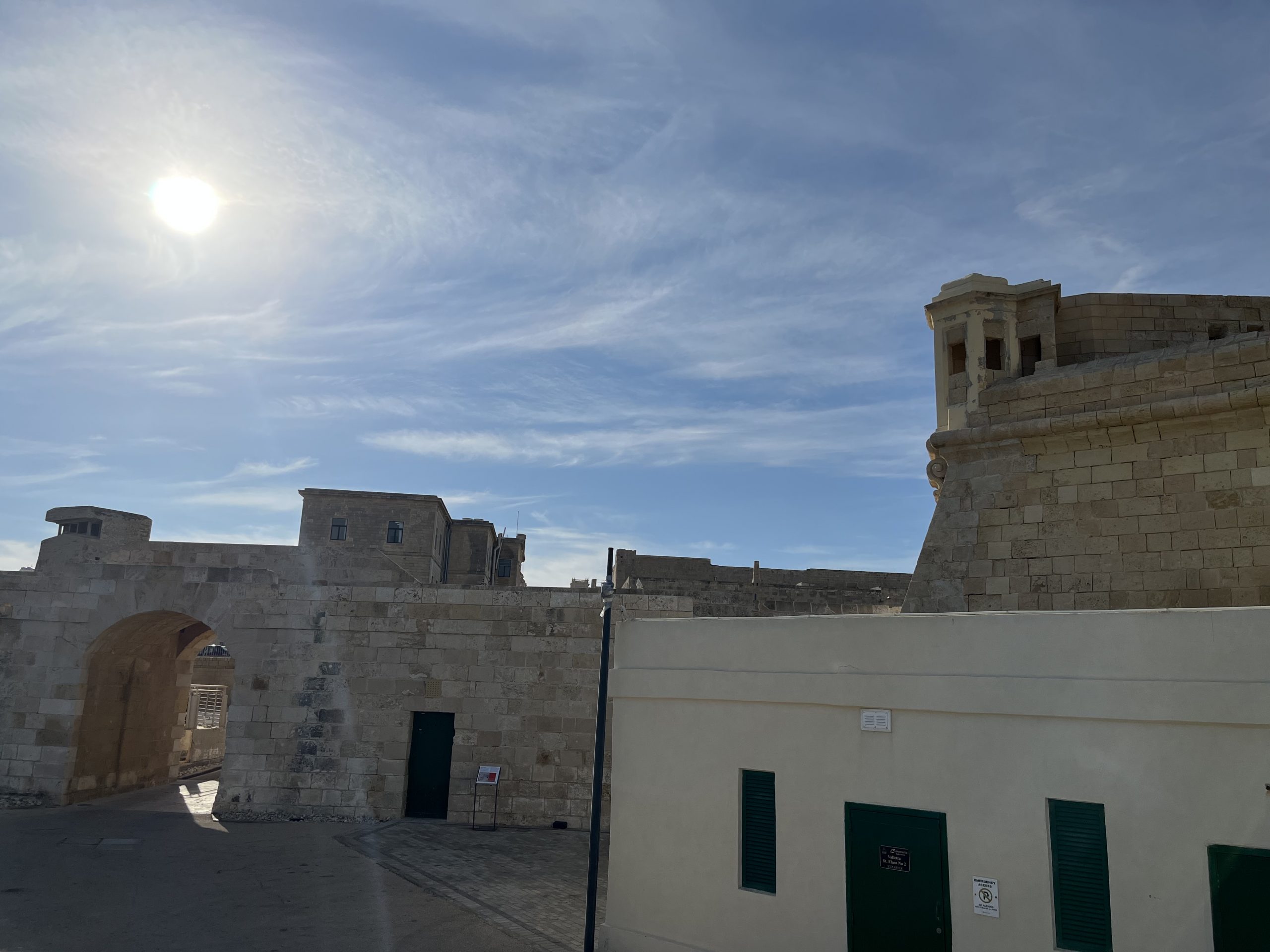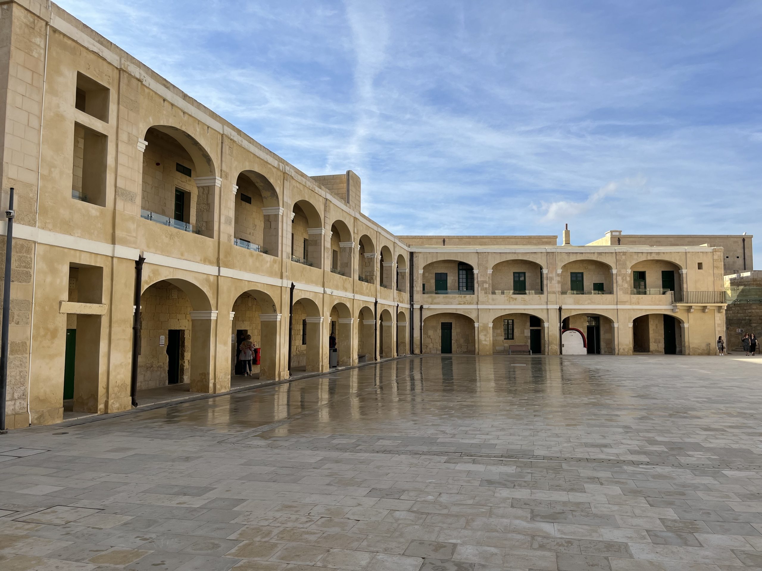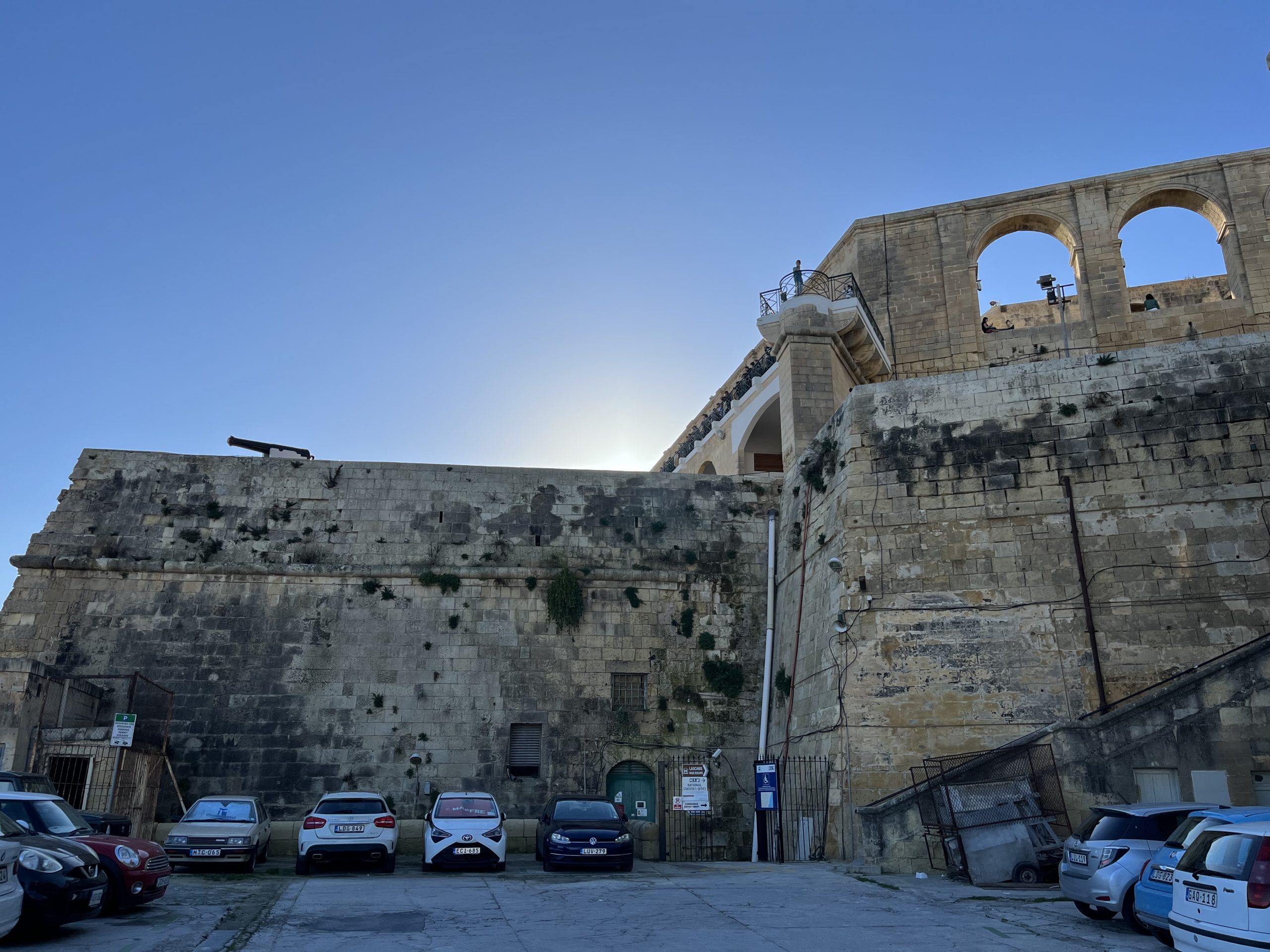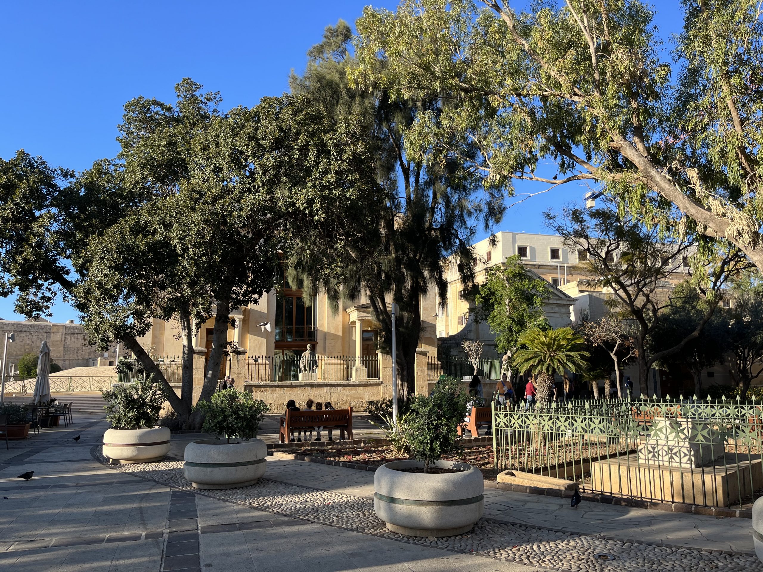 Further down the peninsula that Valletta lies on, is the Lower Barrakka Gardens. This location includes the Siege Bell War Memorial which commemorates the Maltese defense of the island during World War II that resulted in Malta being awarded the George Cross. Continuing down to the end of the peninsula one arrives at Fort St Elmo – see the gallery for photos of the extensive fortifications as well as views from the ramparts.