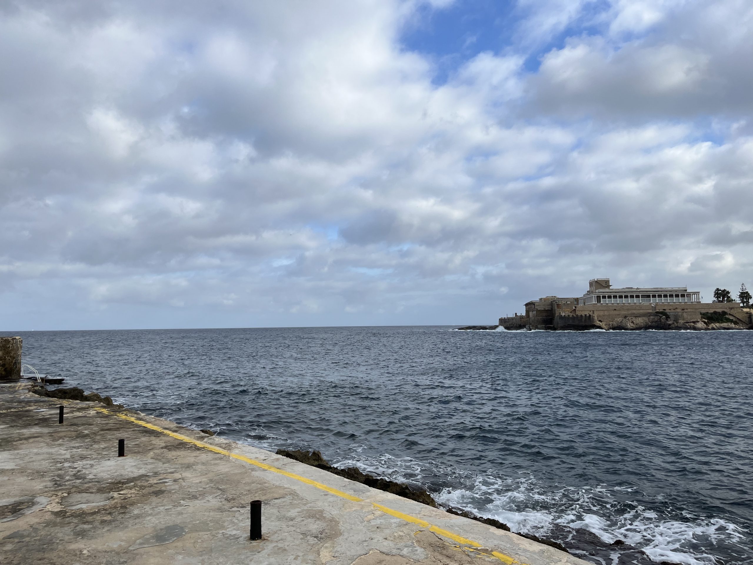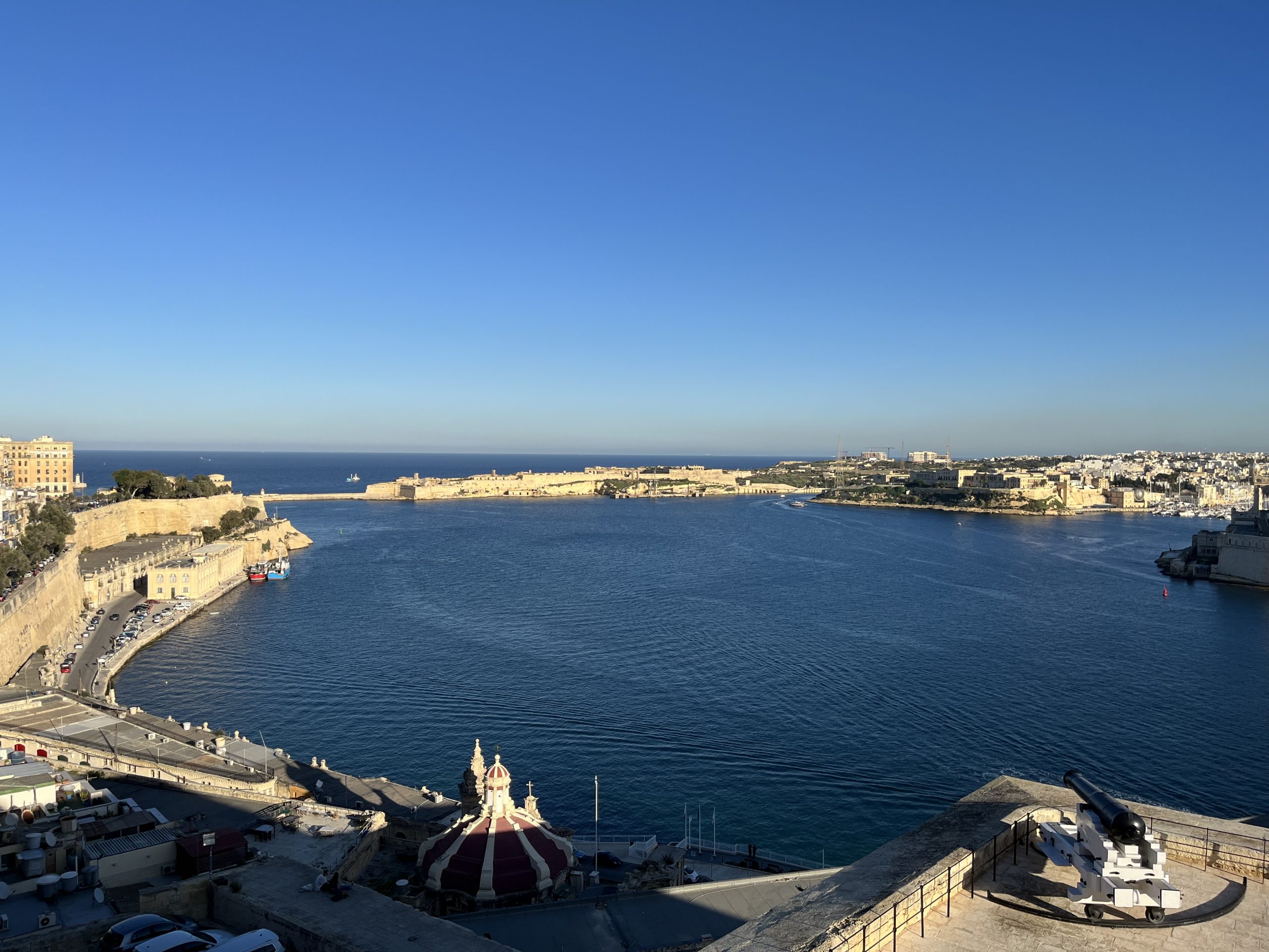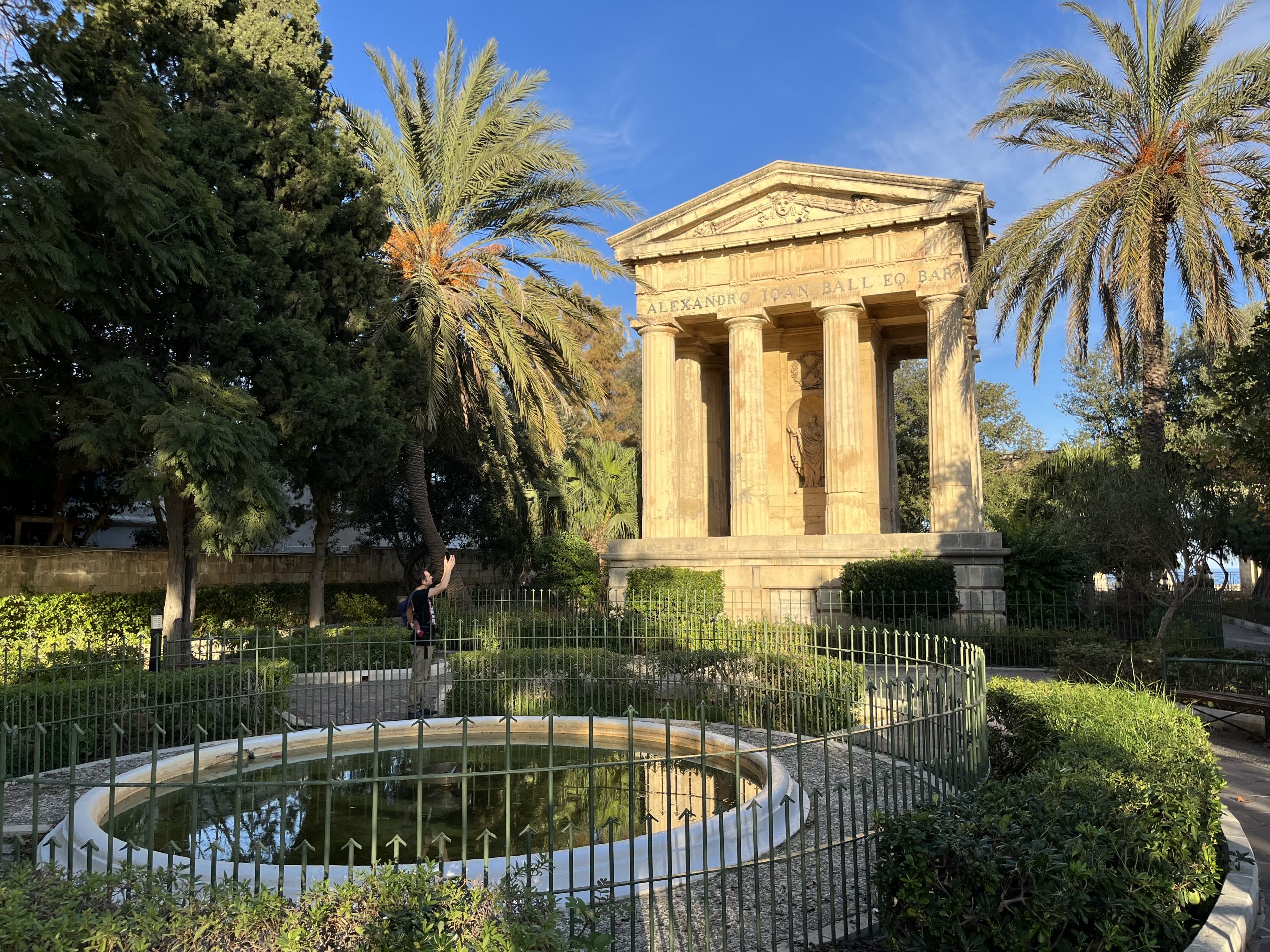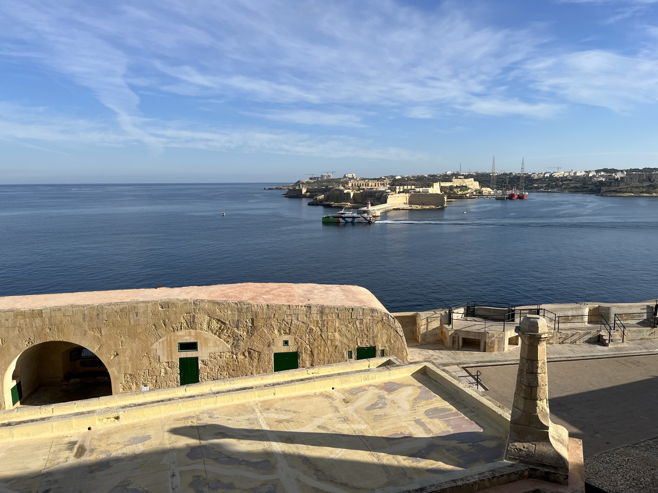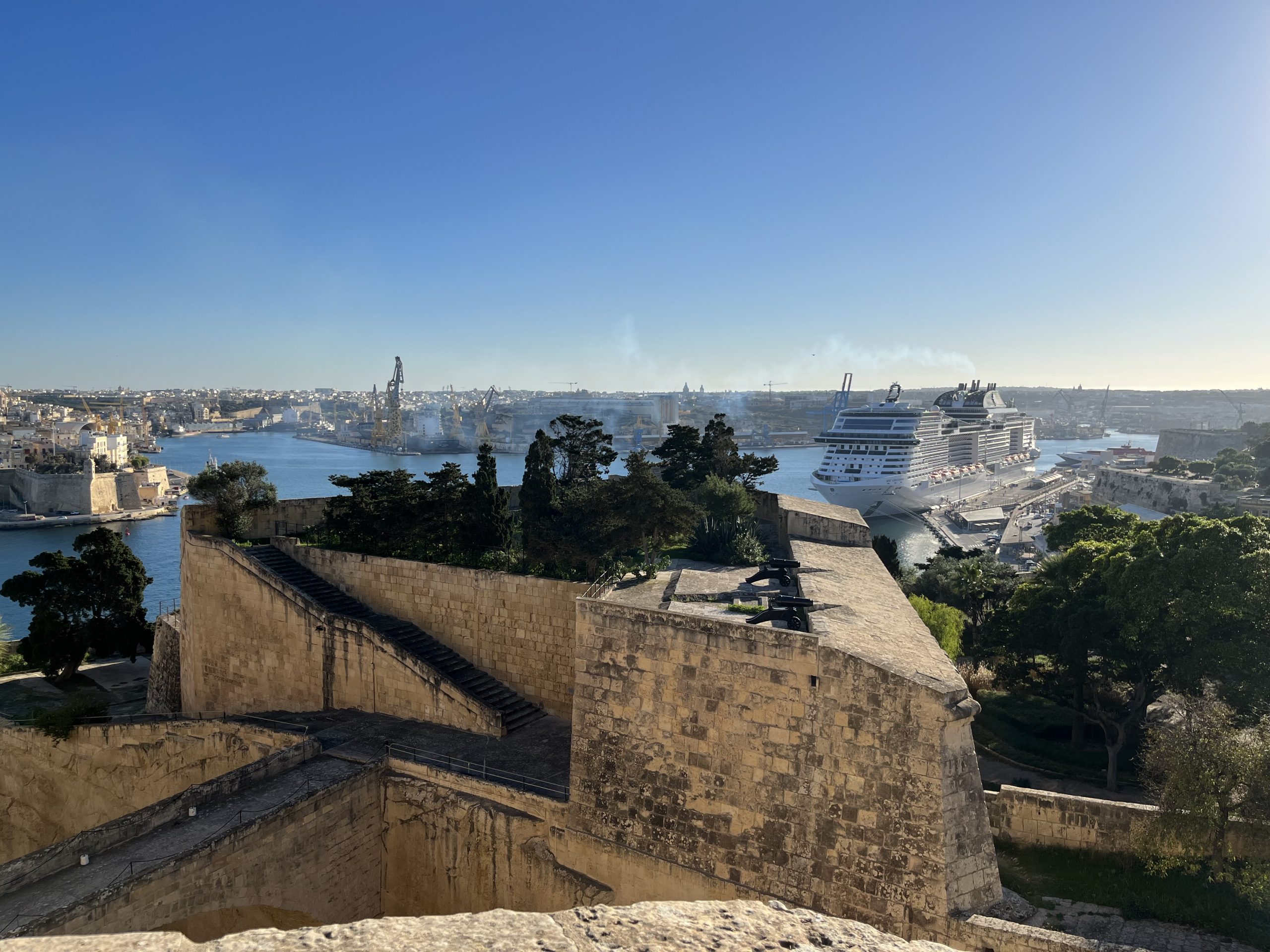 Further down the peninsula that Valletta lies on, is the Lower Barrakka Gardens. This location includes the Siege Bell War Memorial which commemorates the Maltese defense of the island during World War II that resulted in Malta being awarded the George Cross. Continuing down to the end of the peninsula one arrives at Fort St Elmo – see the gallery for photos of the extensive fortifications as well as views from the ramparts.
