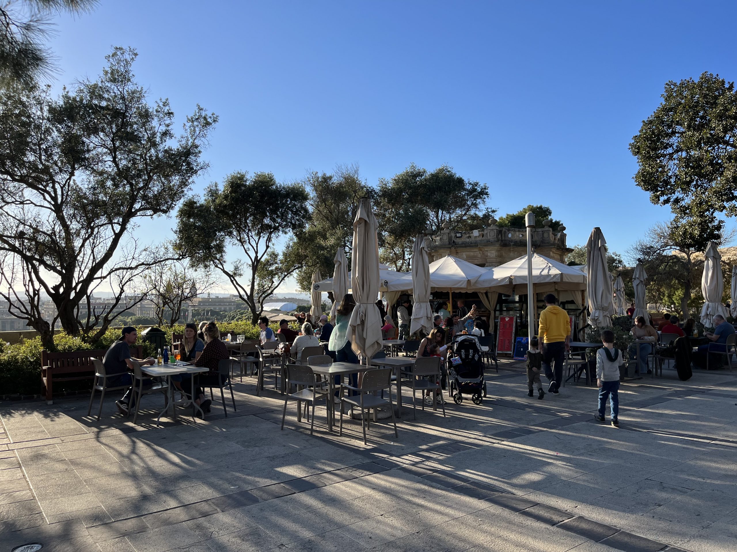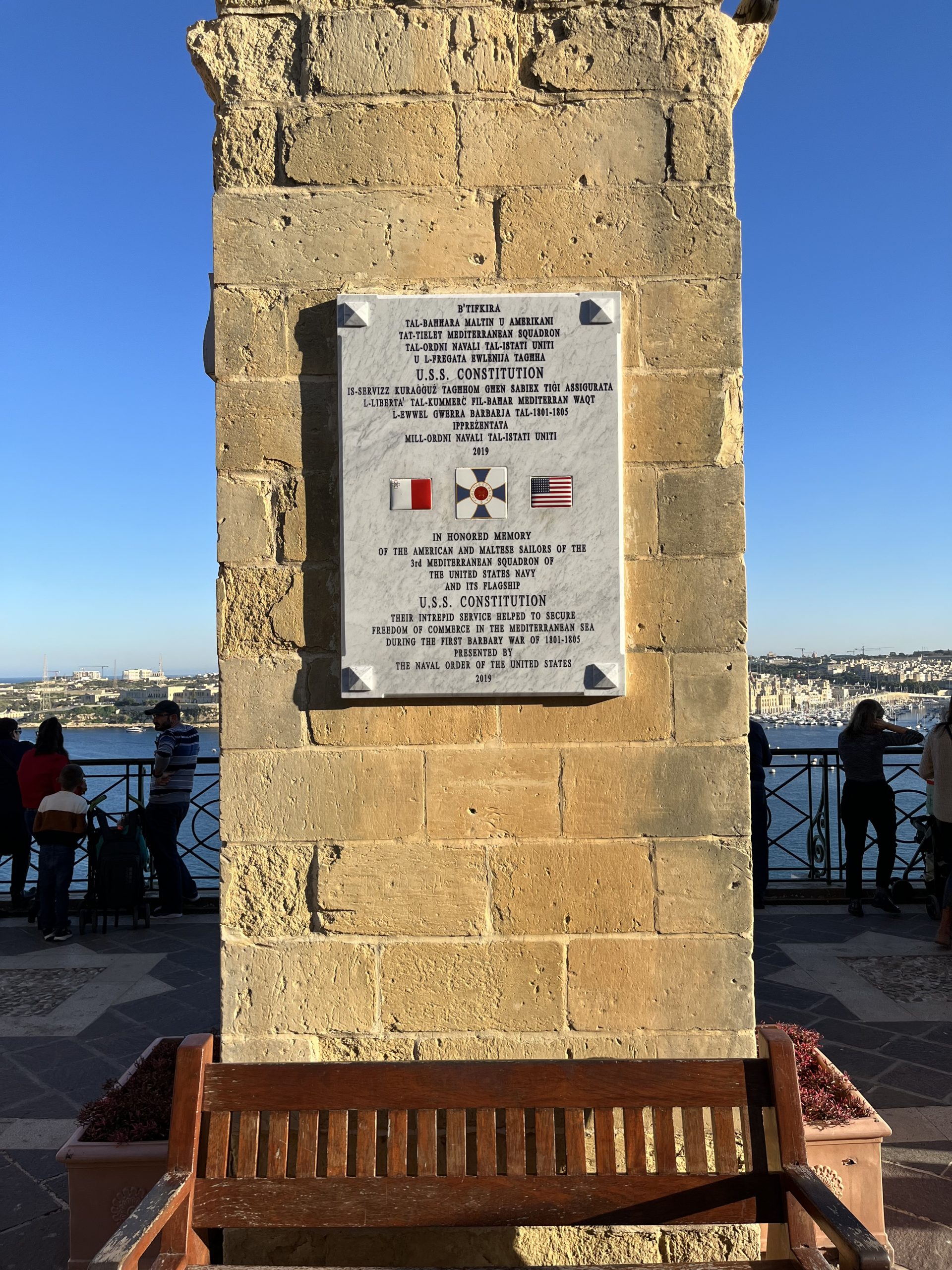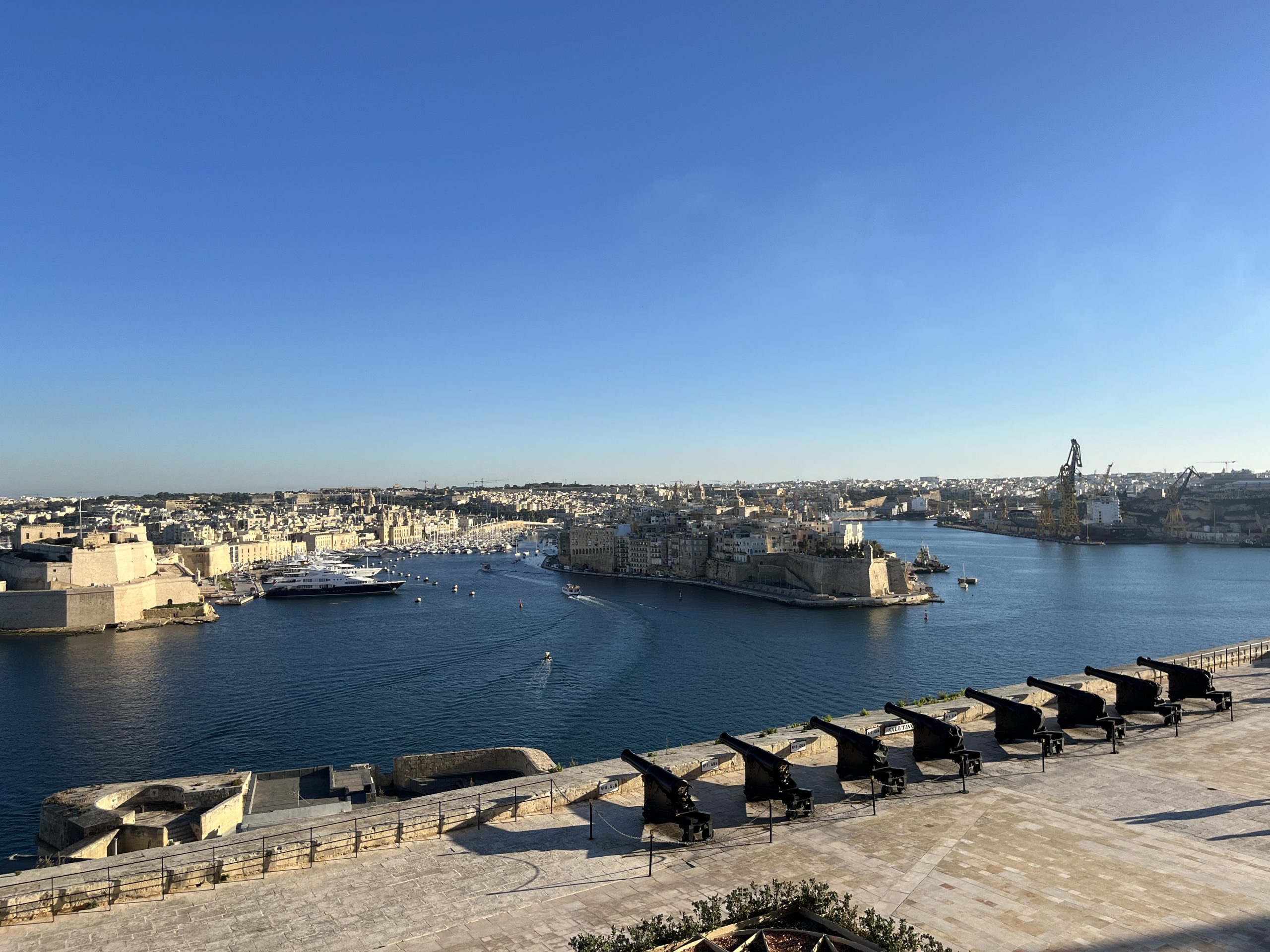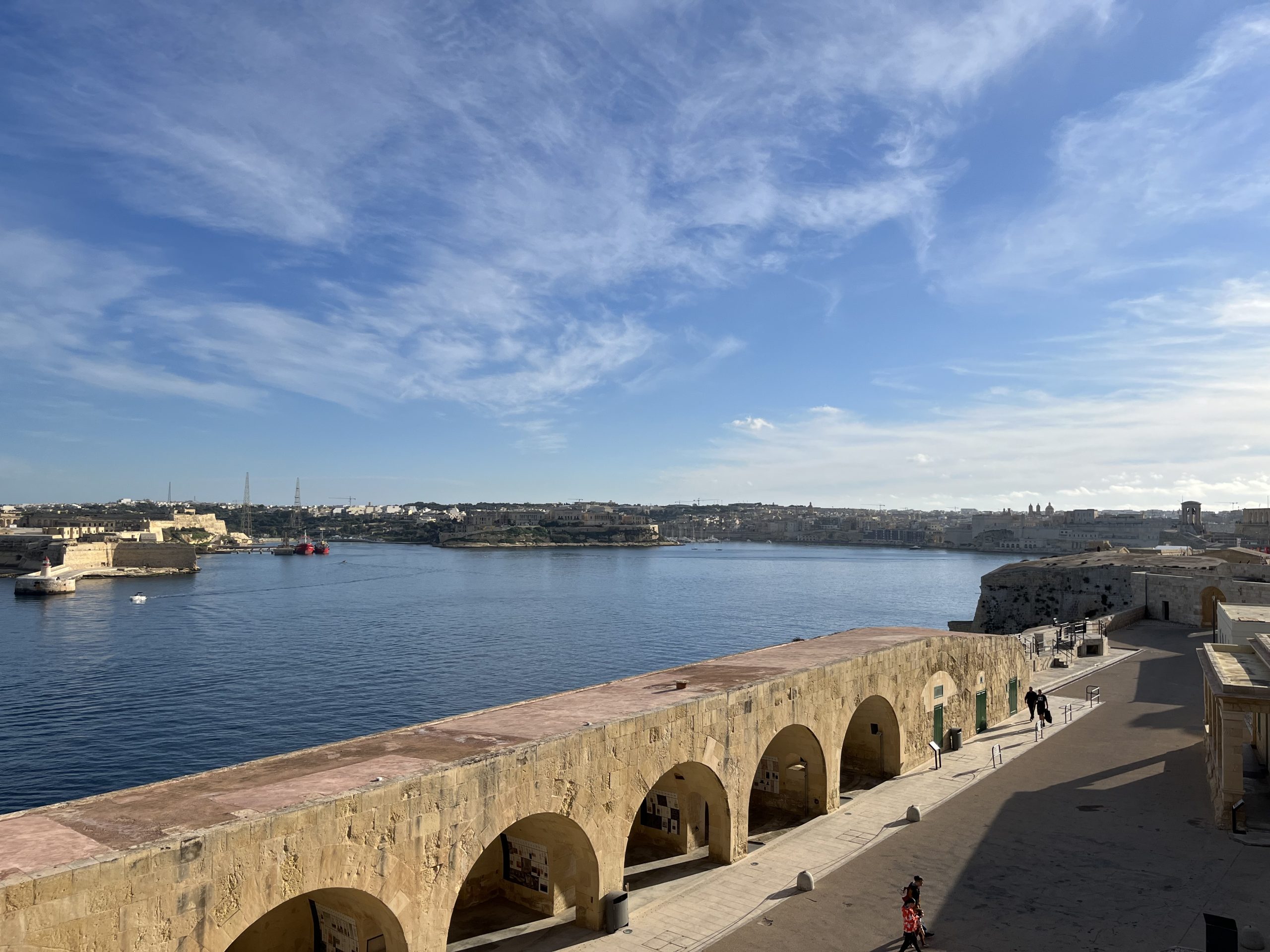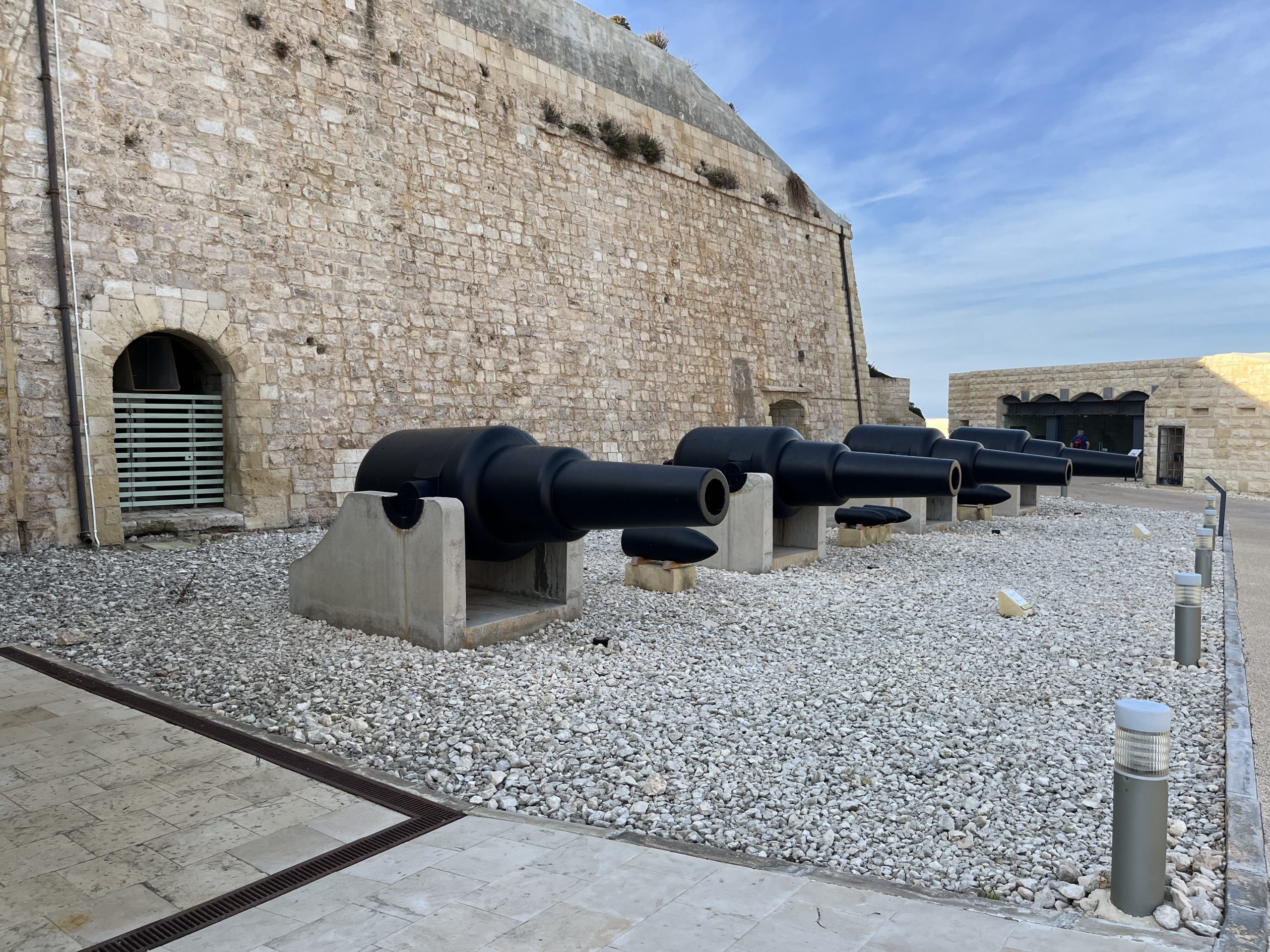 Further down the peninsula that Valletta lies on, is the Lower Barrakka Gardens. This location includes the Siege Bell War Memorial which commemorates the Maltese defense of the island during World War II that resulted in Malta being awarded the George Cross. Continuing down to the end of the peninsula one arrives at Fort St Elmo – see the gallery for photos of the extensive fortifications as well as views from the ramparts.