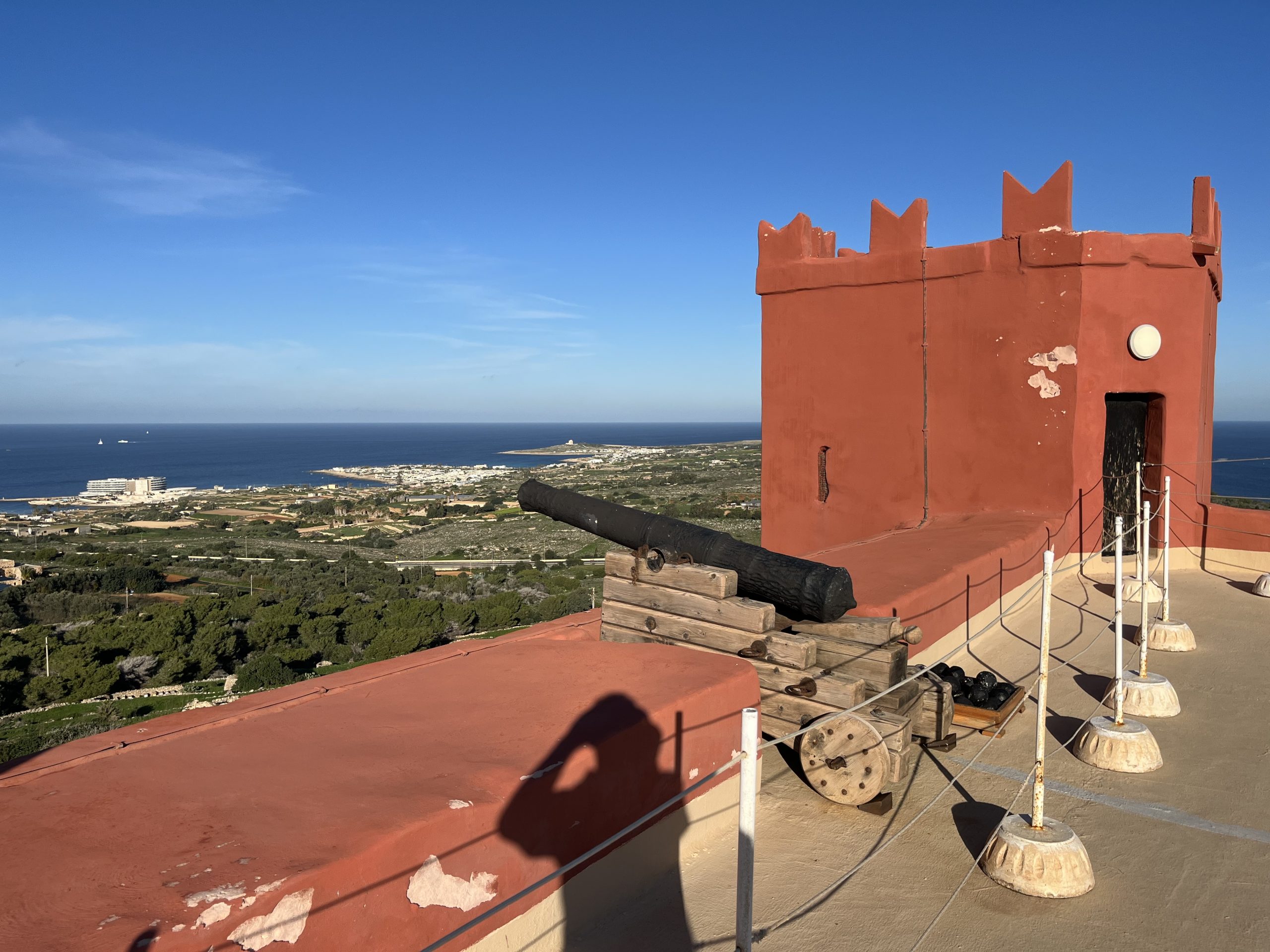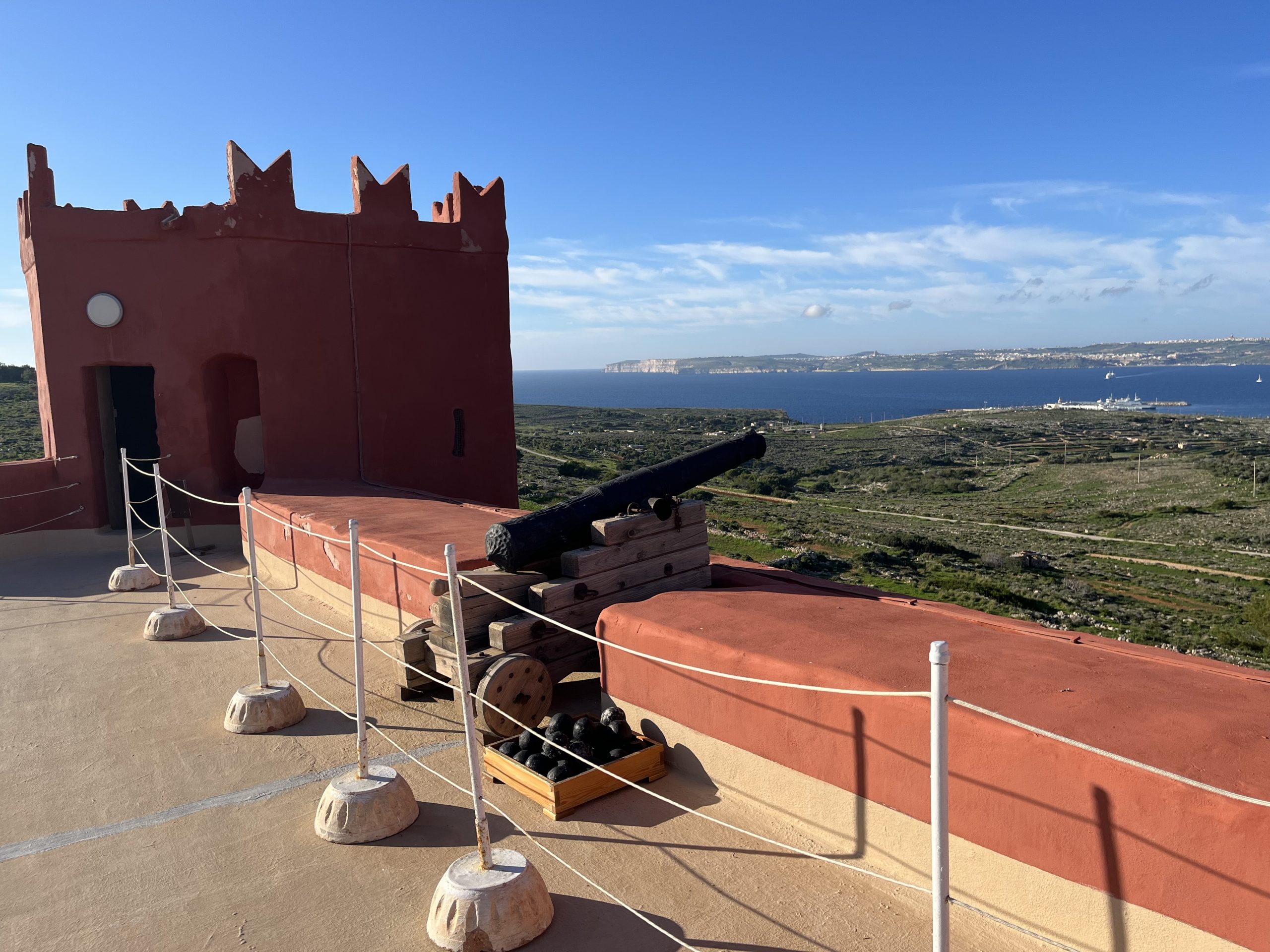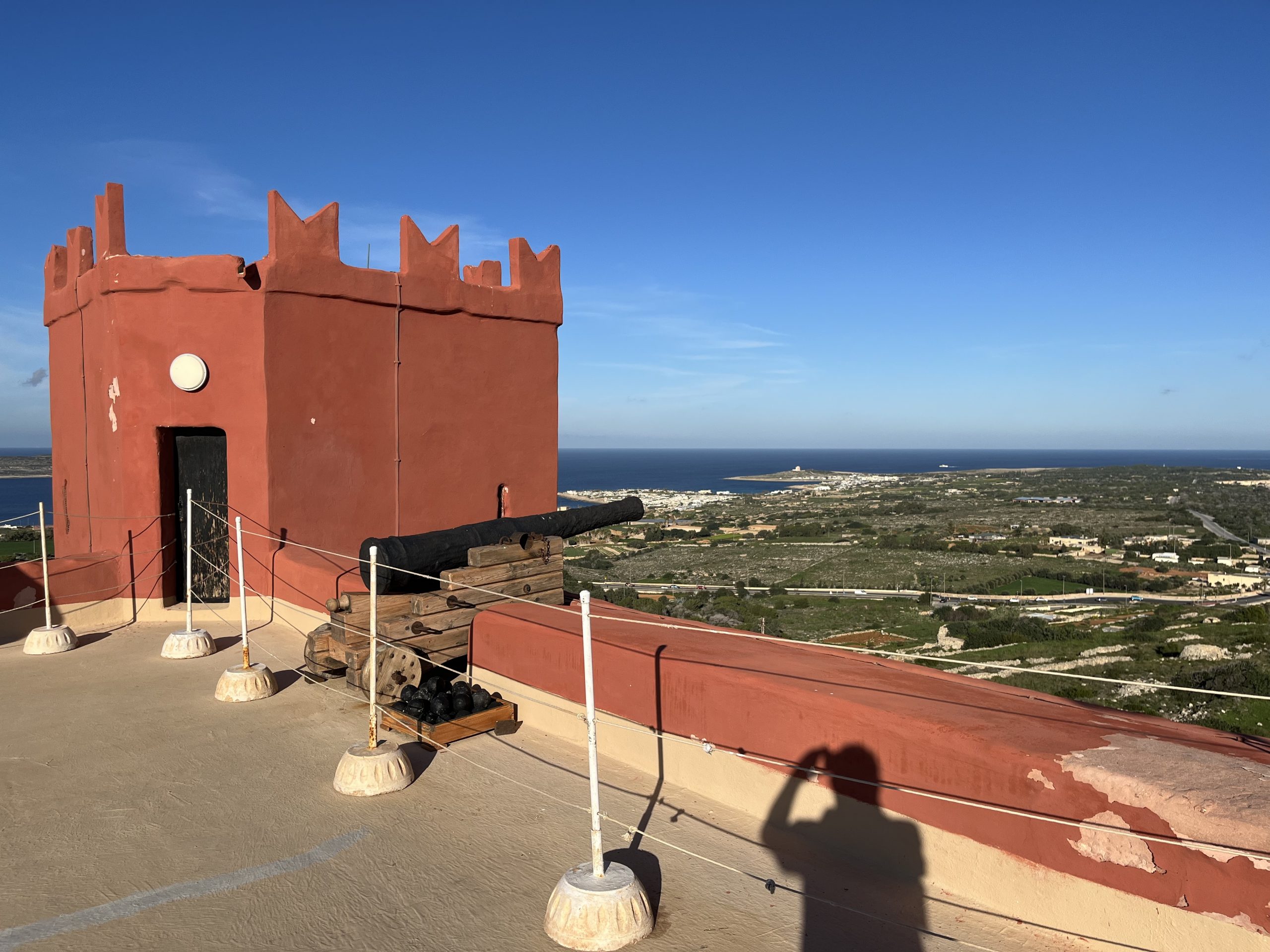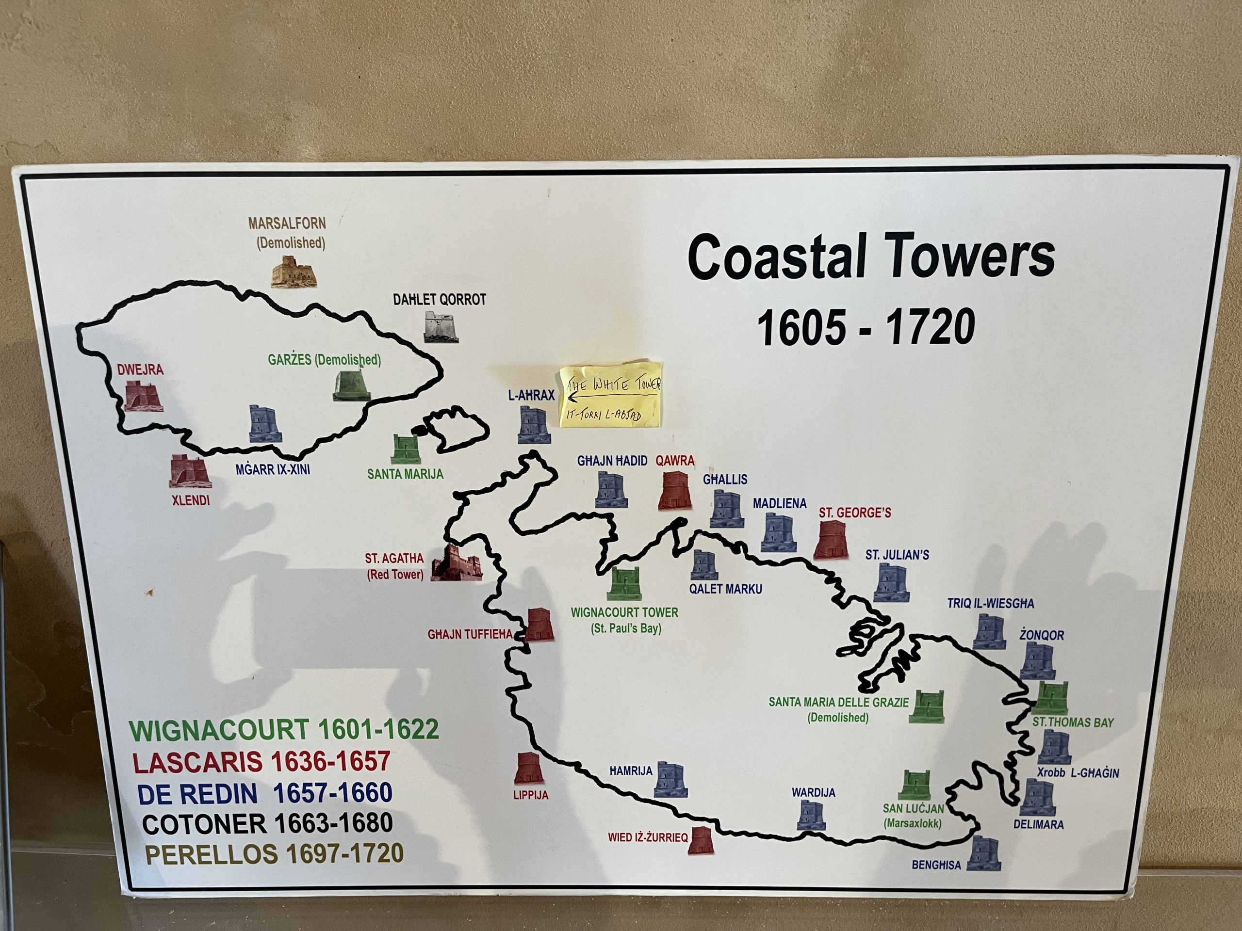 At the north end of the main island of Malta past the town of Mellieha is the Red Tower. It was one (if not the most colorful) of a series of defensive towers on the inhabited islands. From the tower, one can see Comino (population of two or three) and Gozo (population of 32,000 plus). In addition, other towers are visible, including the White Tower. Most of the towers are simply known by their Maltese name, but a few are also known by the name of a saint. The gallery has a photo of a poster board showing all the towers.