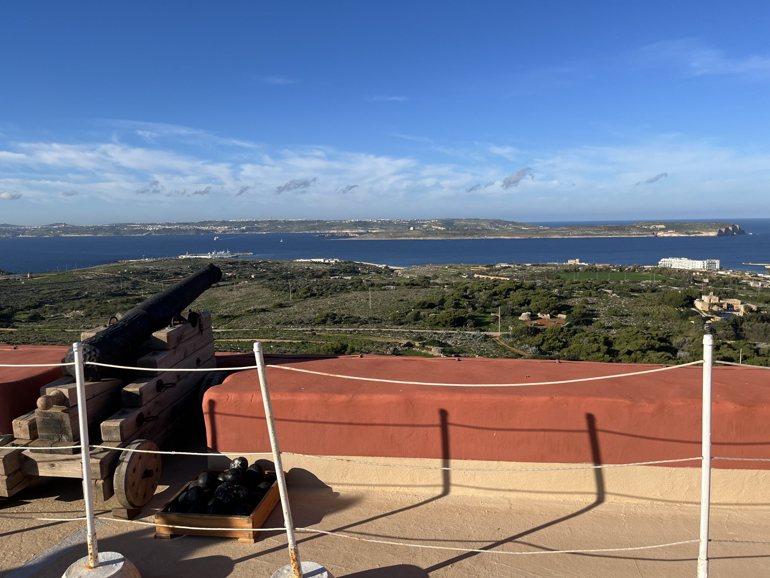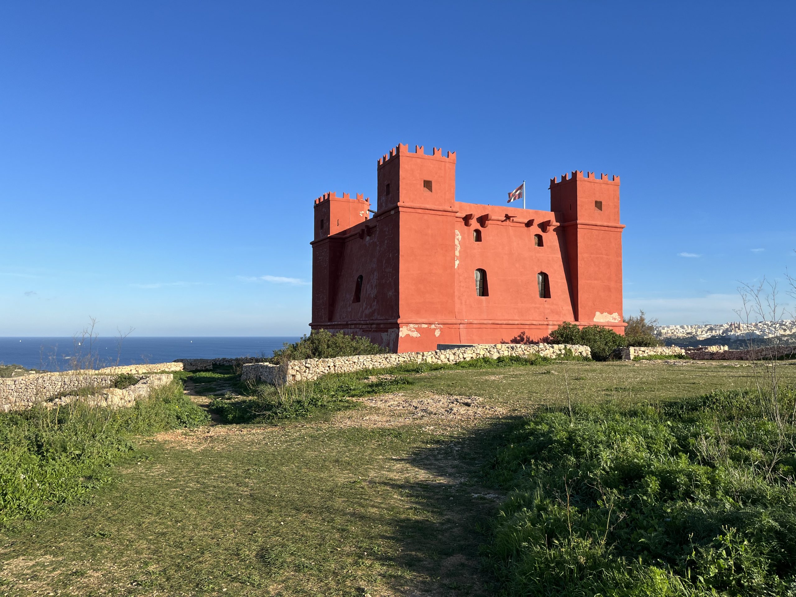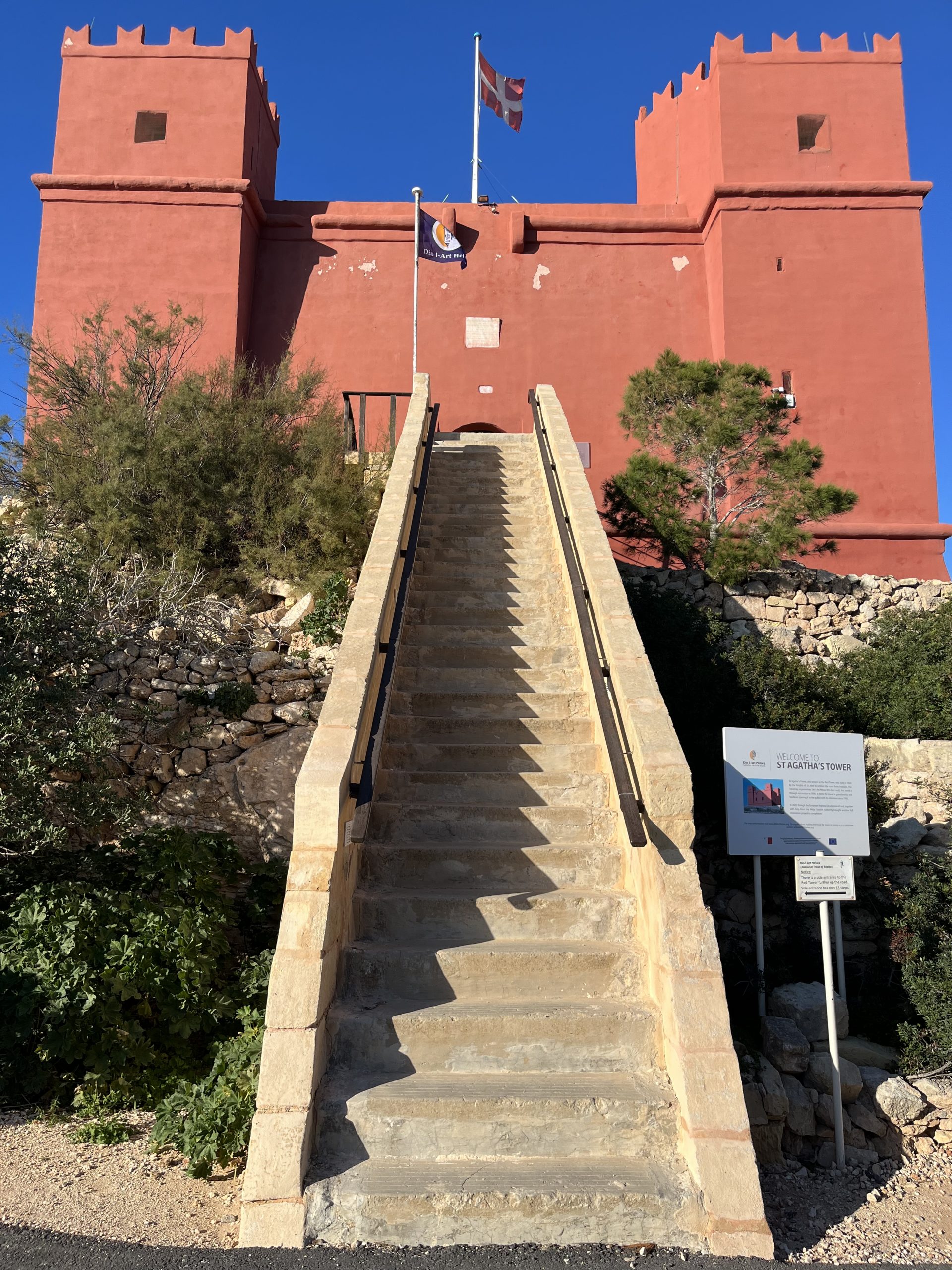 At the north end of the main island of Malta past the town of Mellieha is the Red Tower. It was one (if not the most colorful) of a series of defensive towers on the inhabited islands. From the tower, one can see Comino (population of two or three) and Gozo (population of 32,000 plus). In addition, other towers are visible, including the White Tower. Most of the towers are simply known by their Maltese name, but a few are also known by the name of a saint. The gallery has a photo of a poster board showing all the towers.