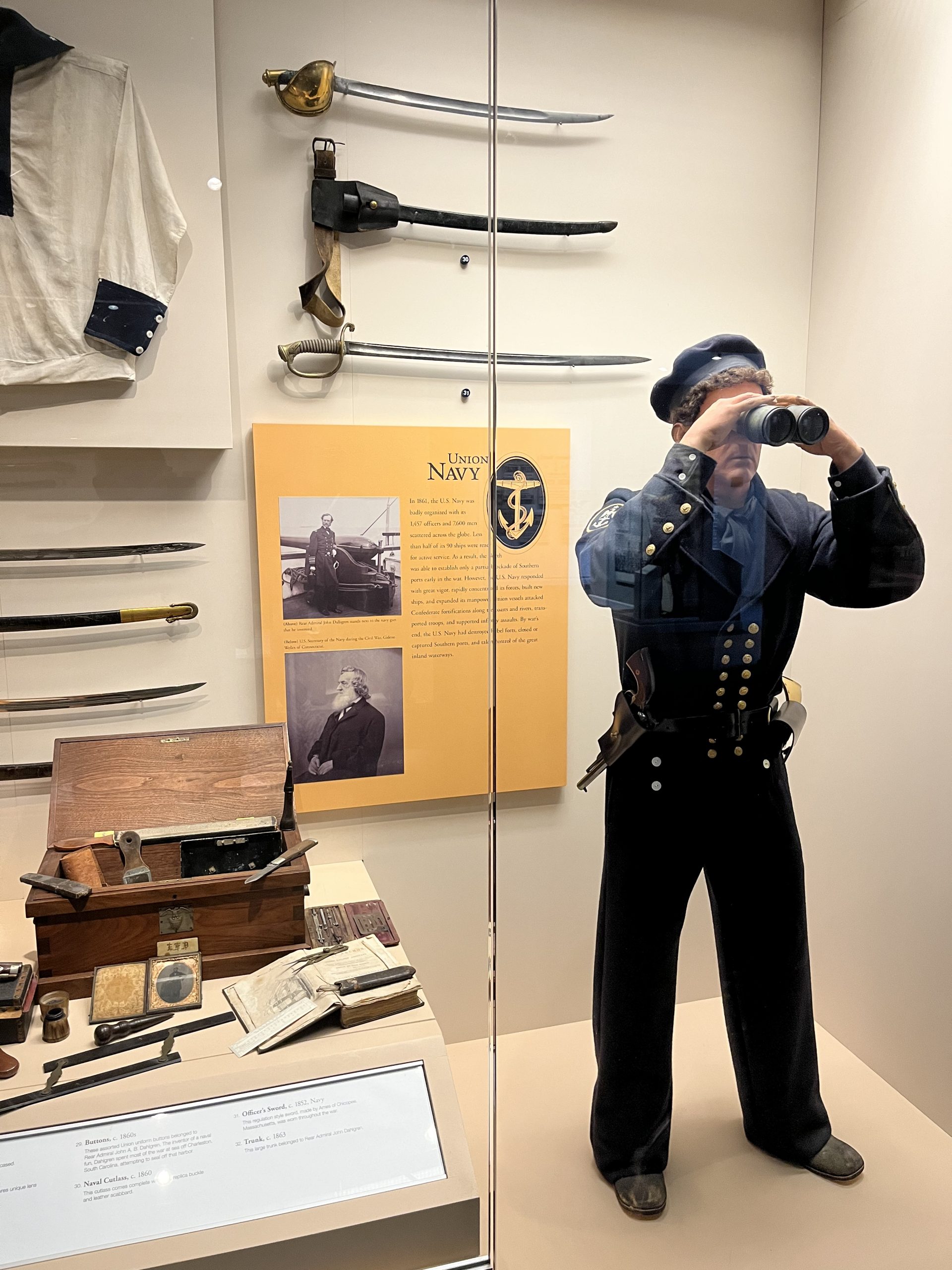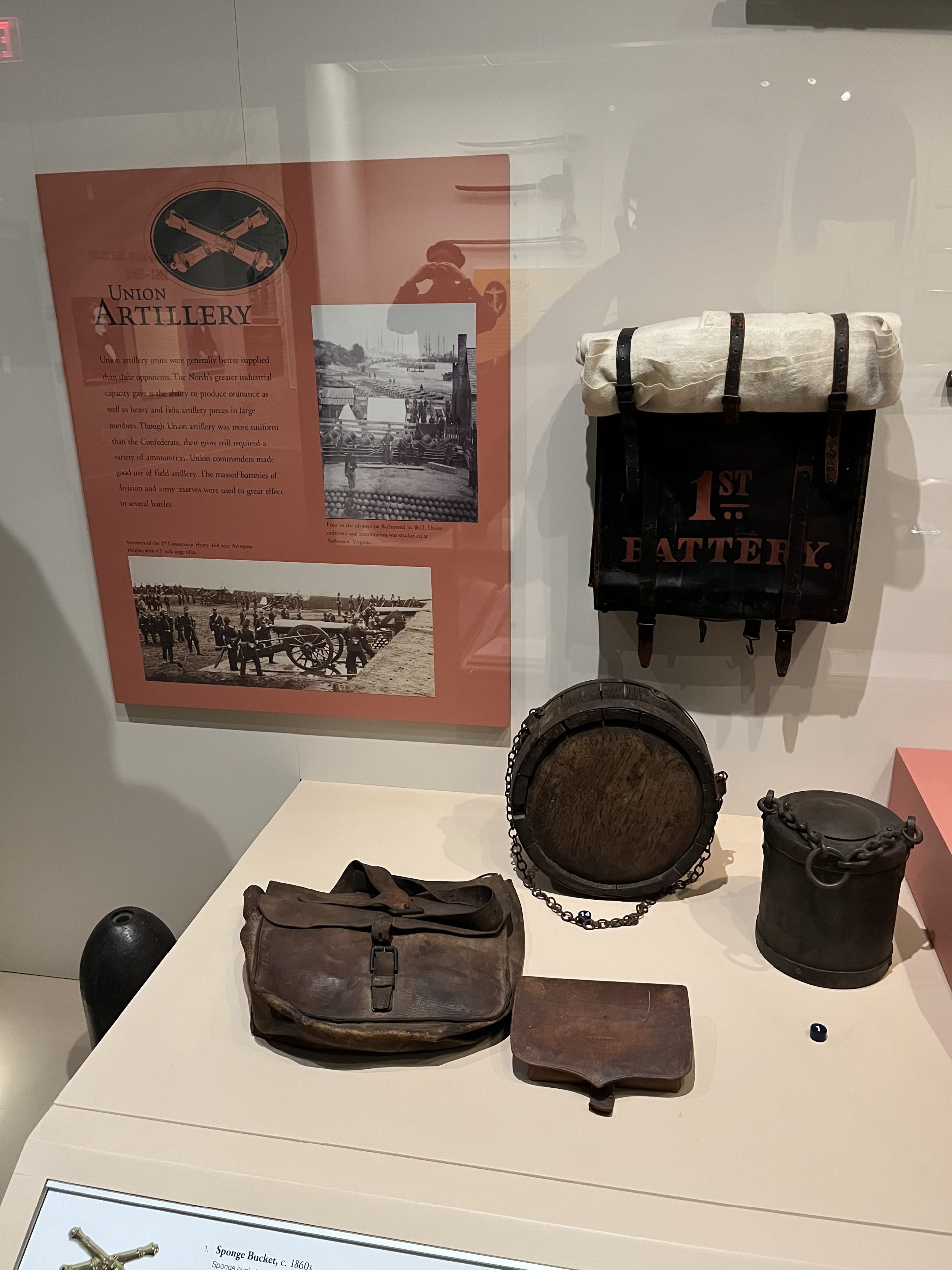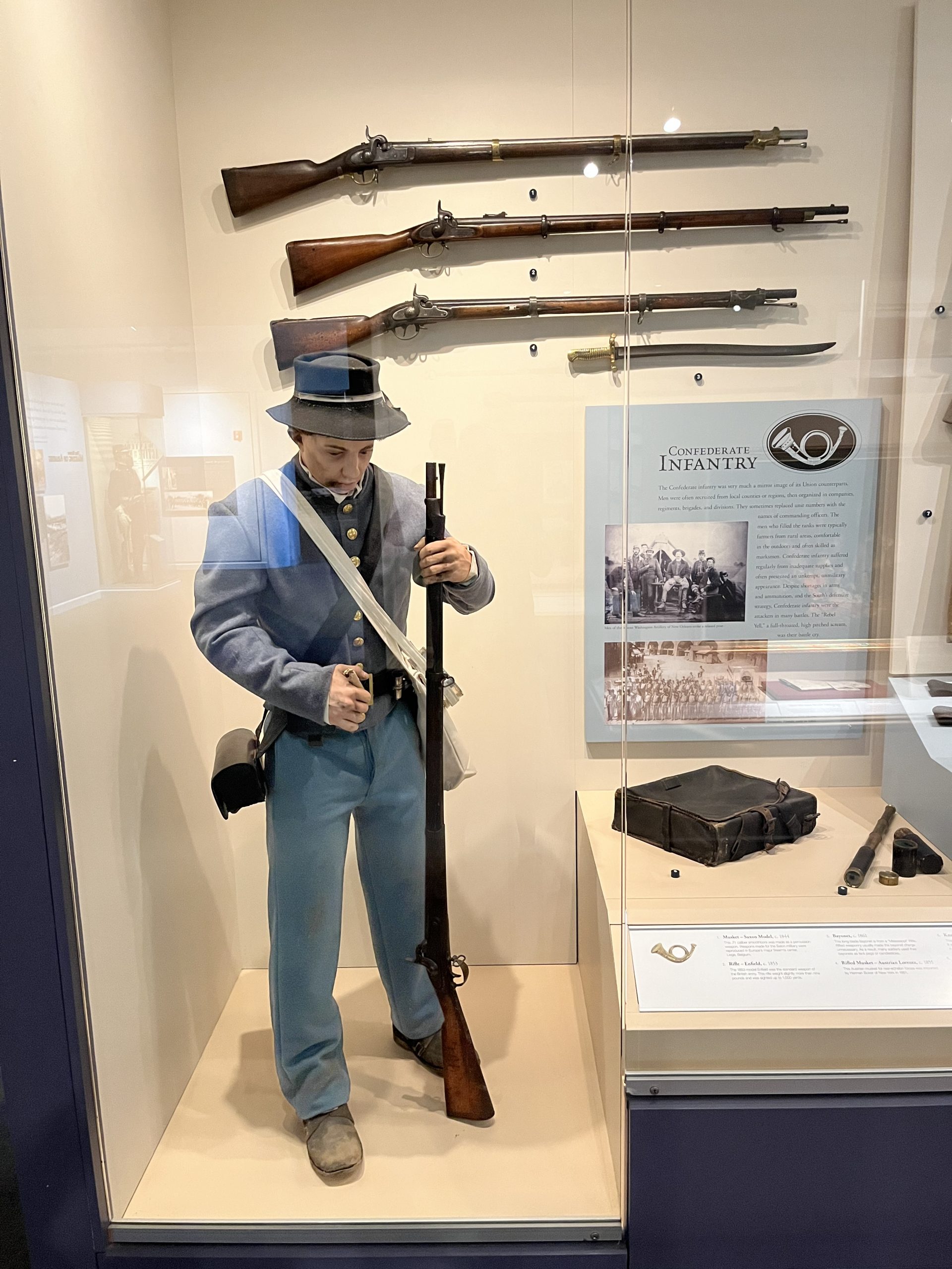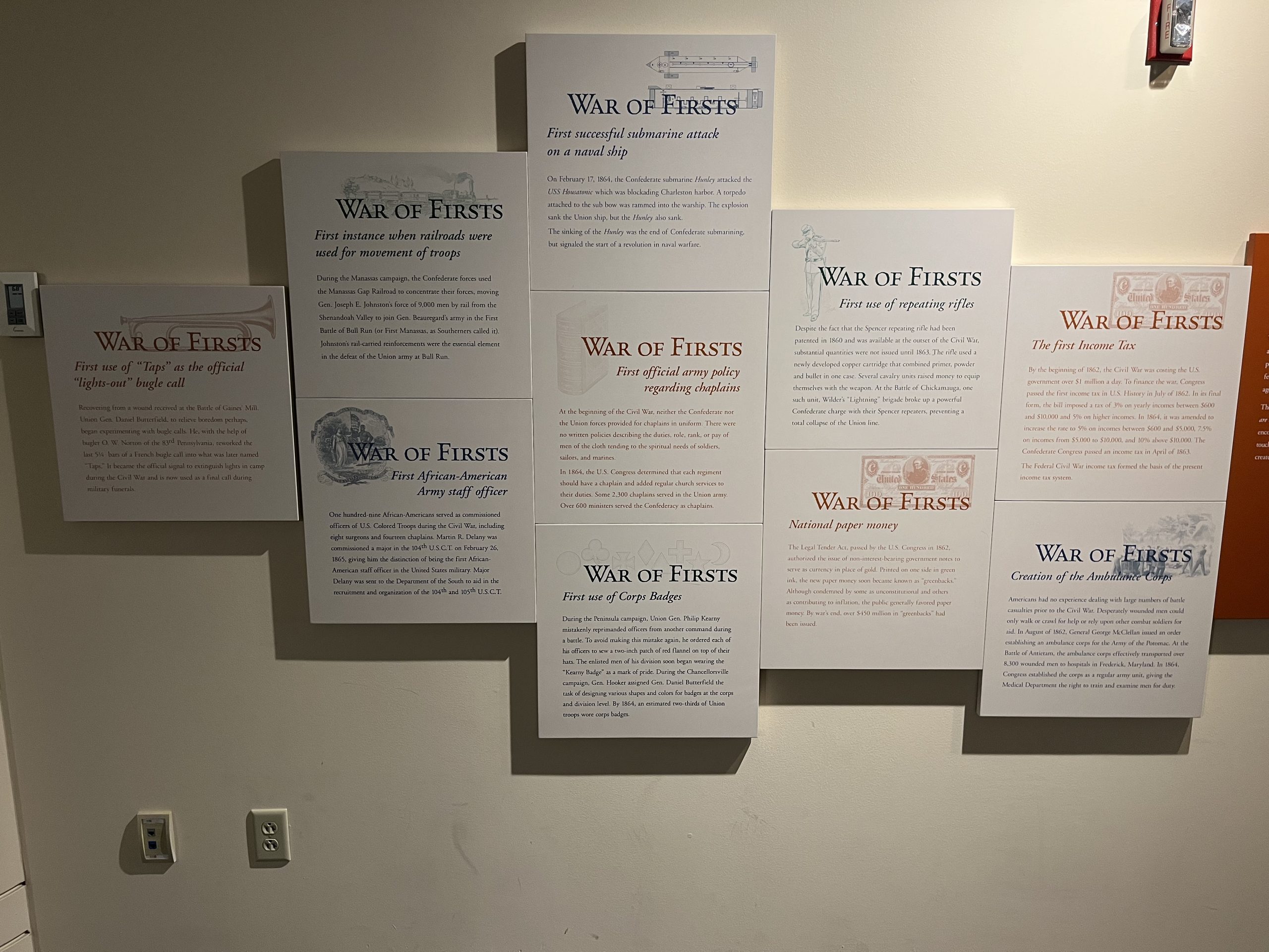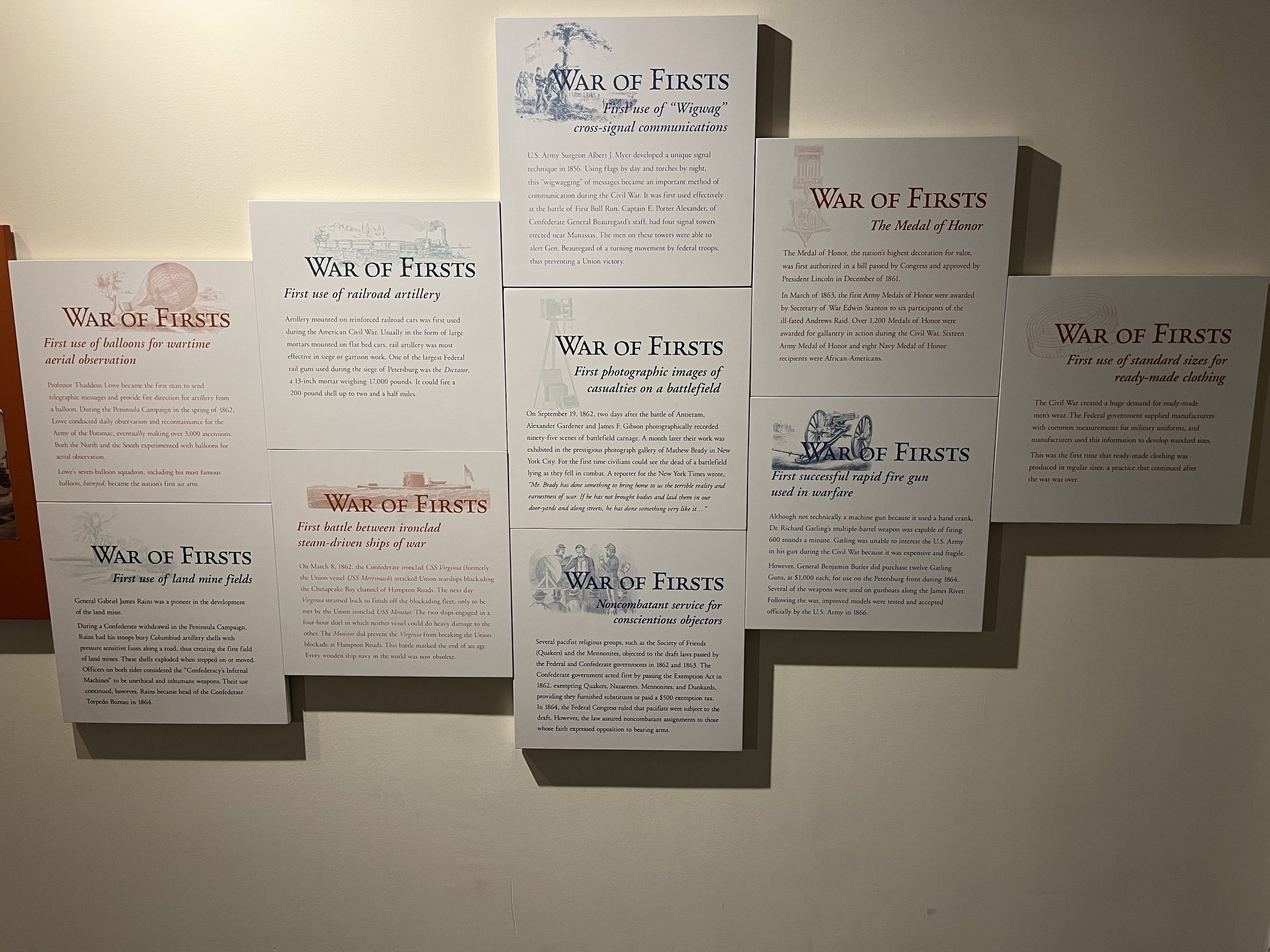 There are exhibits which do a phenomenal job of showing the uniforms and equipment of the various military branches of both the Union and Confederate forces: infantry, cavalry, artillery, and navy. Also, exemplary, in my opinion, are the exhibits presenting the state of medical care during the war. Lastly, there are a couple of photos towards the end of the gallery showing informational placards on the “War of Firsts”. Some of these I captured in photos of exhibits, but not all, so read through the placards in these two photos. They are extremely interesting – as in I didn’t know that!