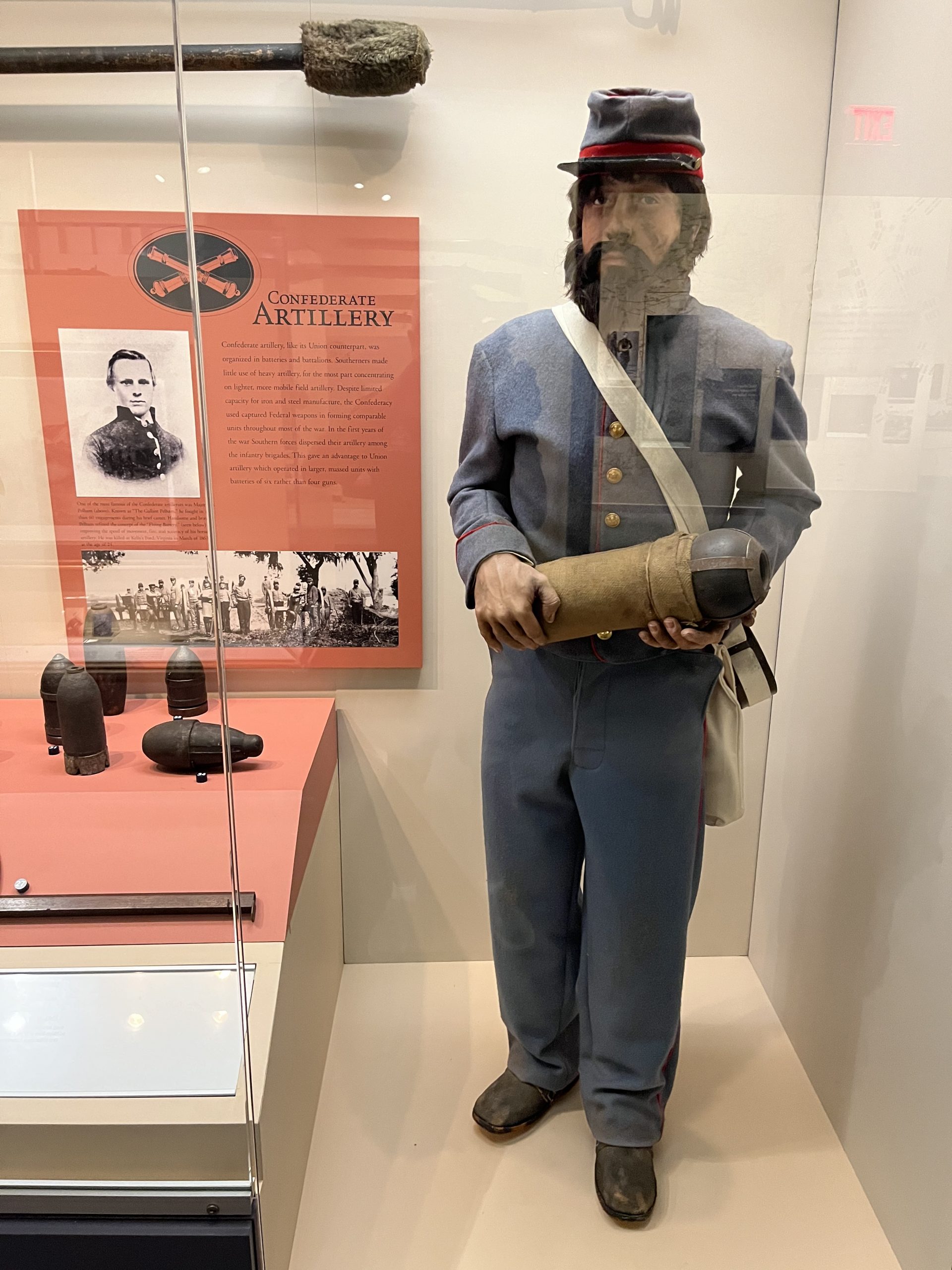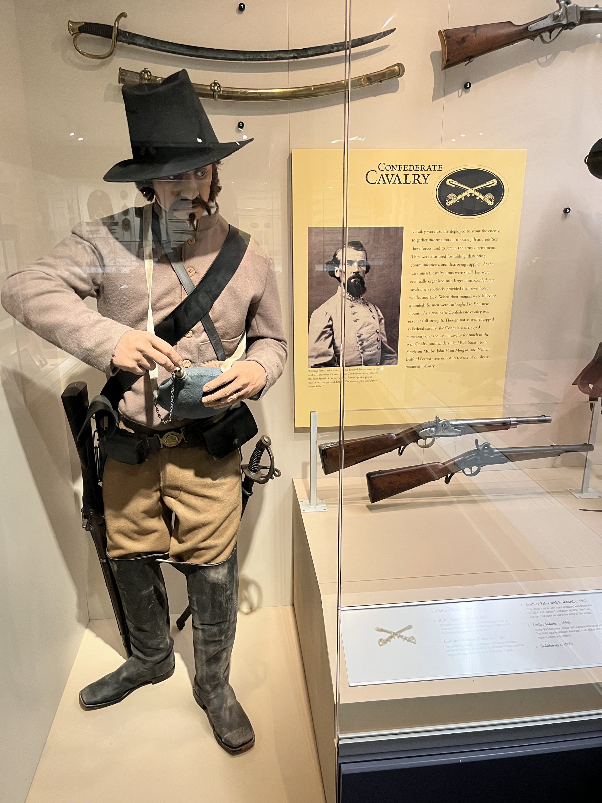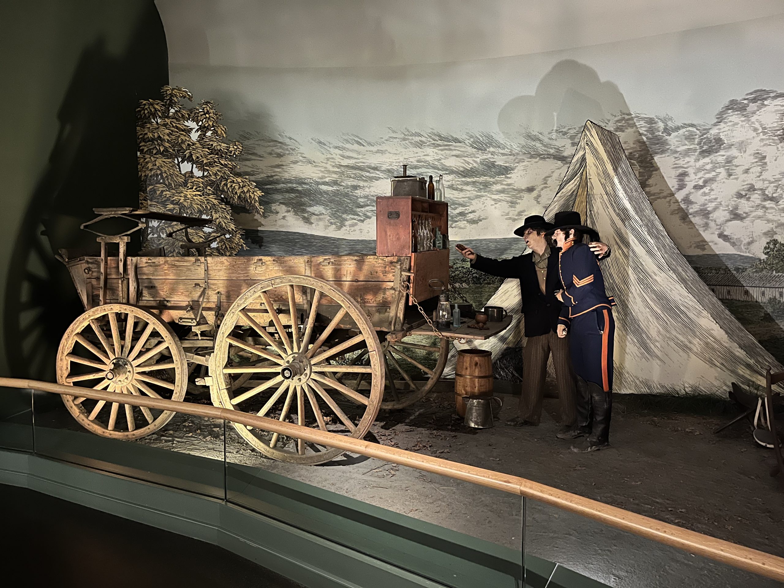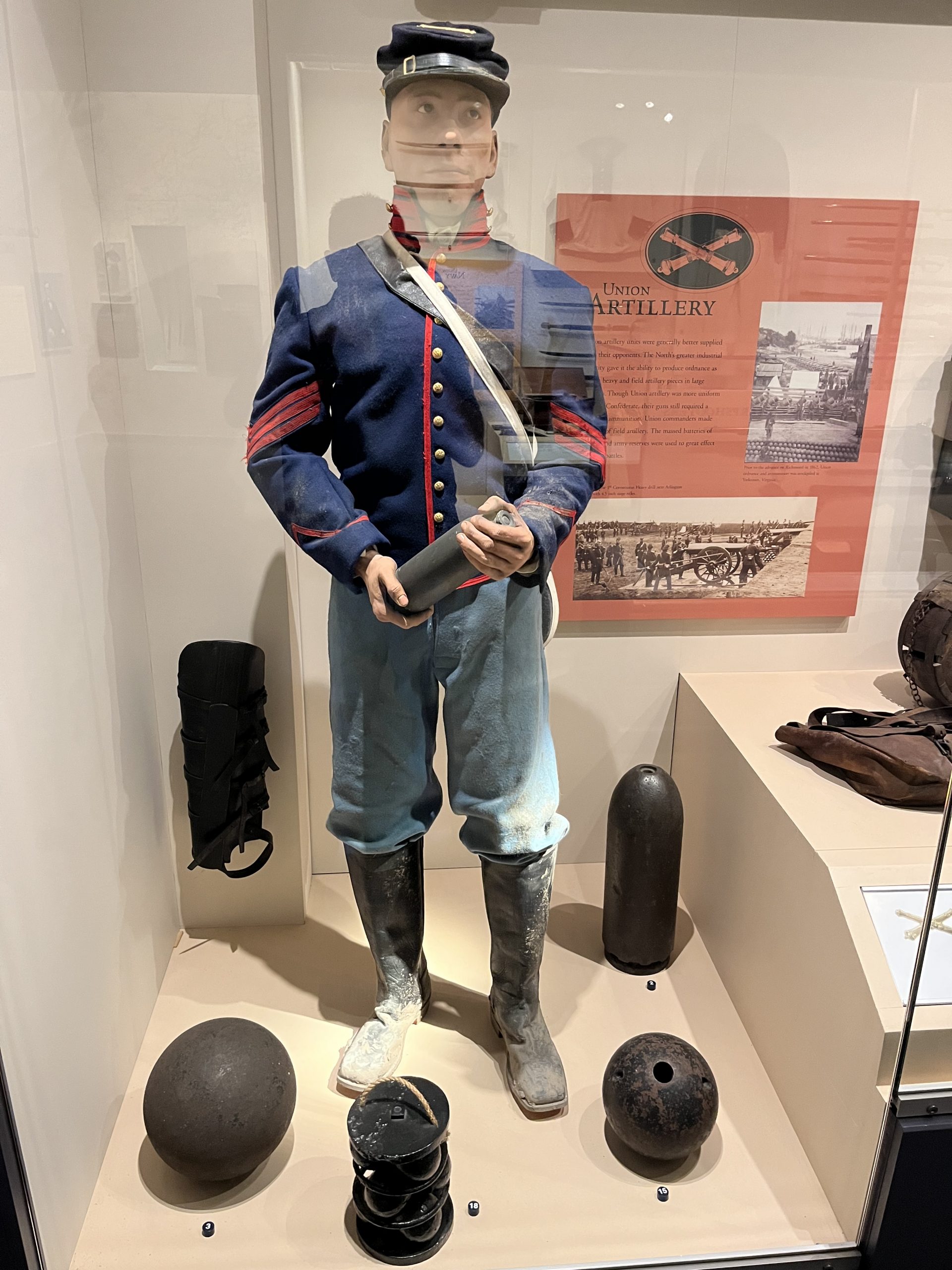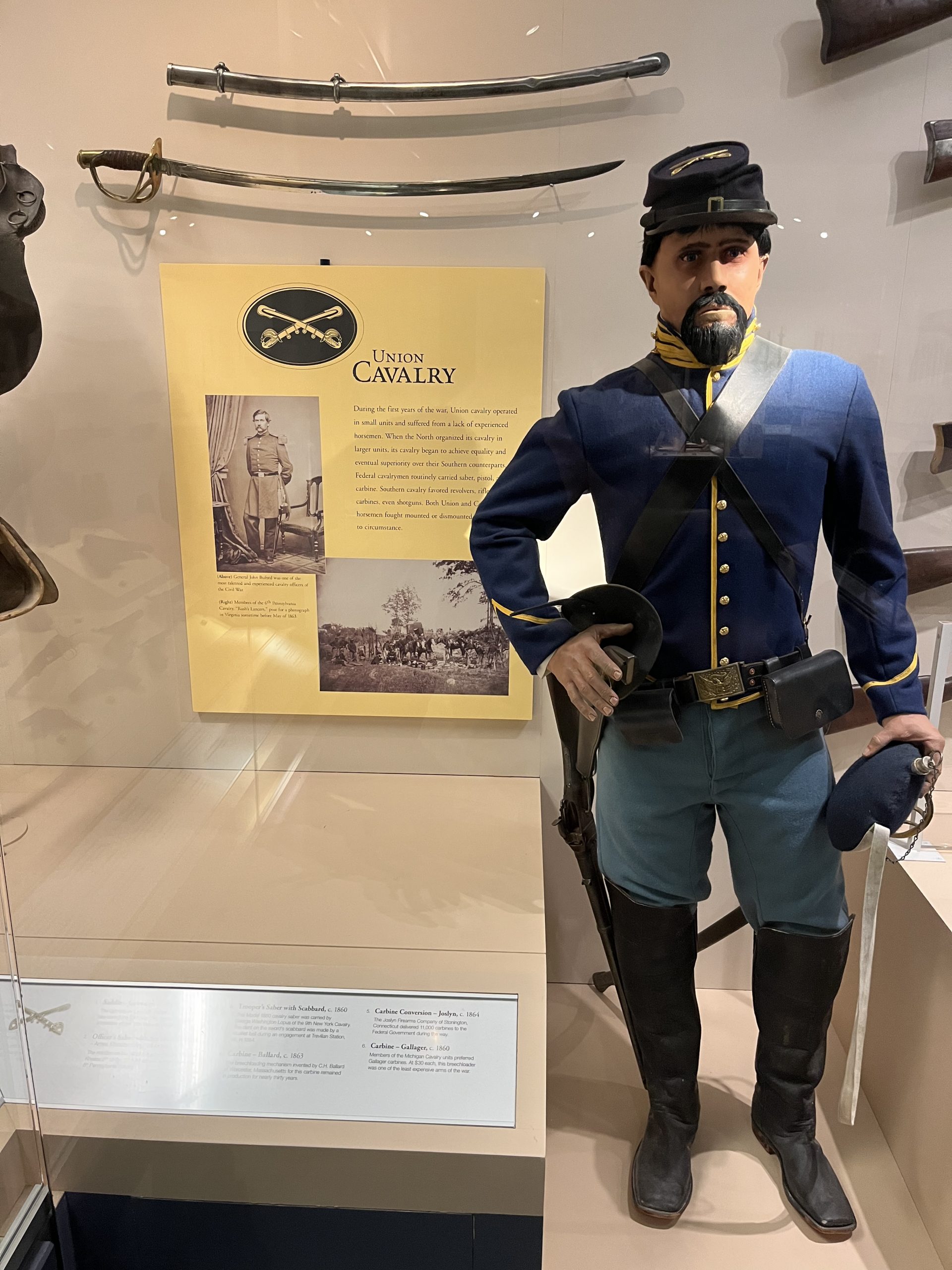There are exhibits which do a phenomenal job of showing the uniforms and equipment of the various military branches of both the Union and Confederate forces: infantry, cavalry, artillery, and navy. Also, exemplary, in my opinion, are the exhibits presenting the state of medical care during the war. Lastly, there are a couple of photos towards the end of the gallery showing informational placards on the “War of Firsts”. Some of these I captured in photos of exhibits, but not all, so read through the placards in these two photos. They are extremely interesting – as in I didn’t know that!