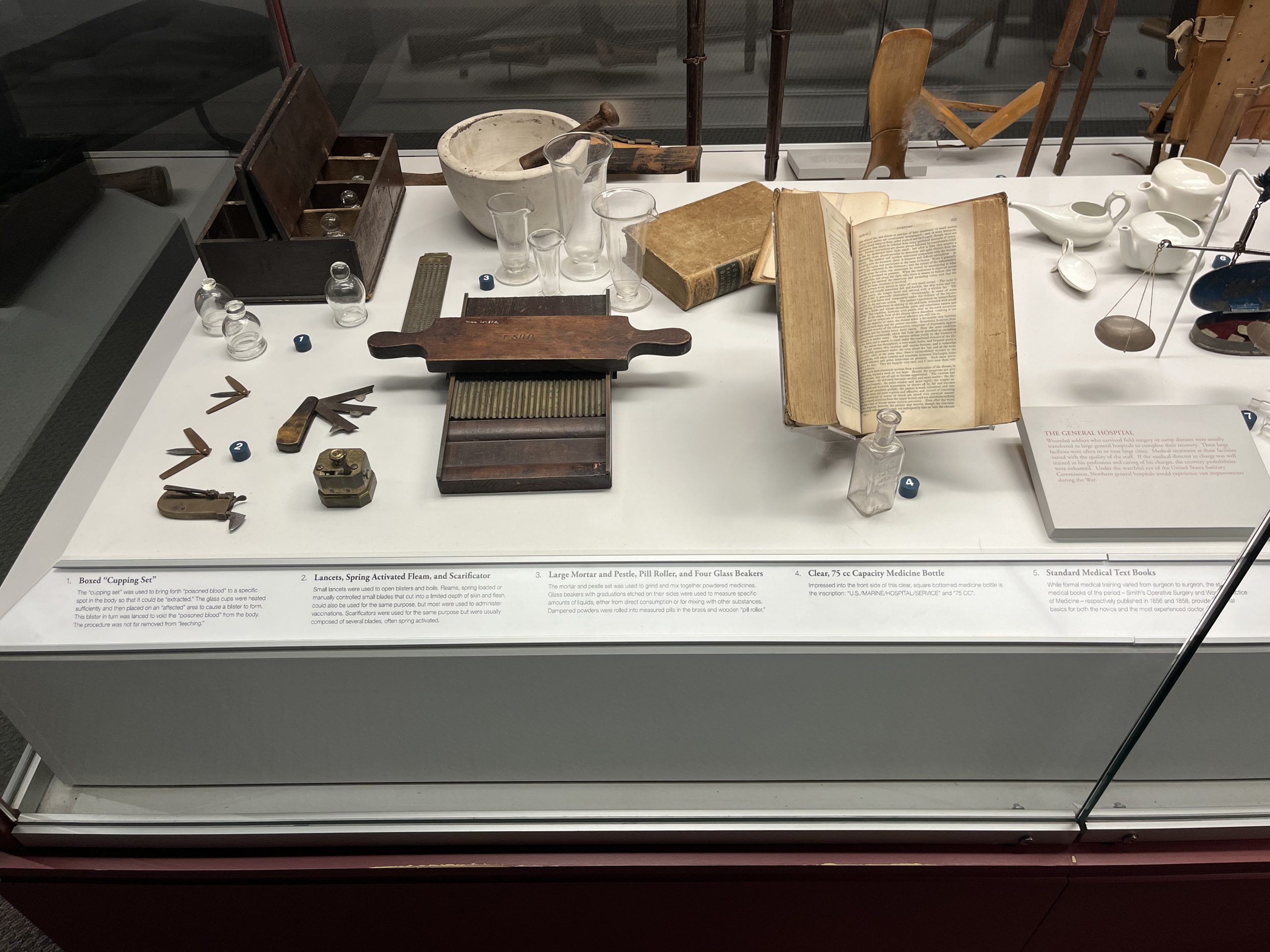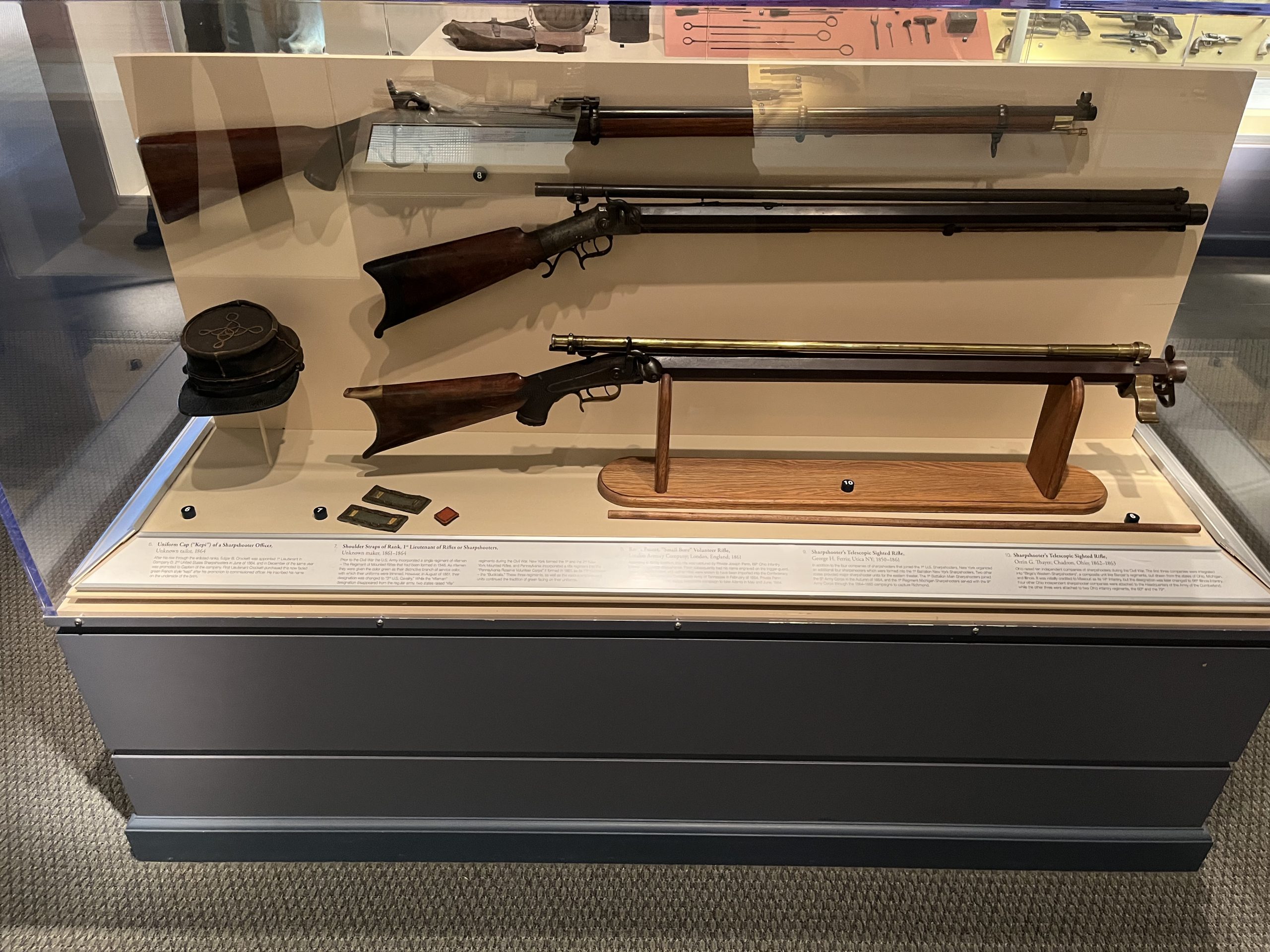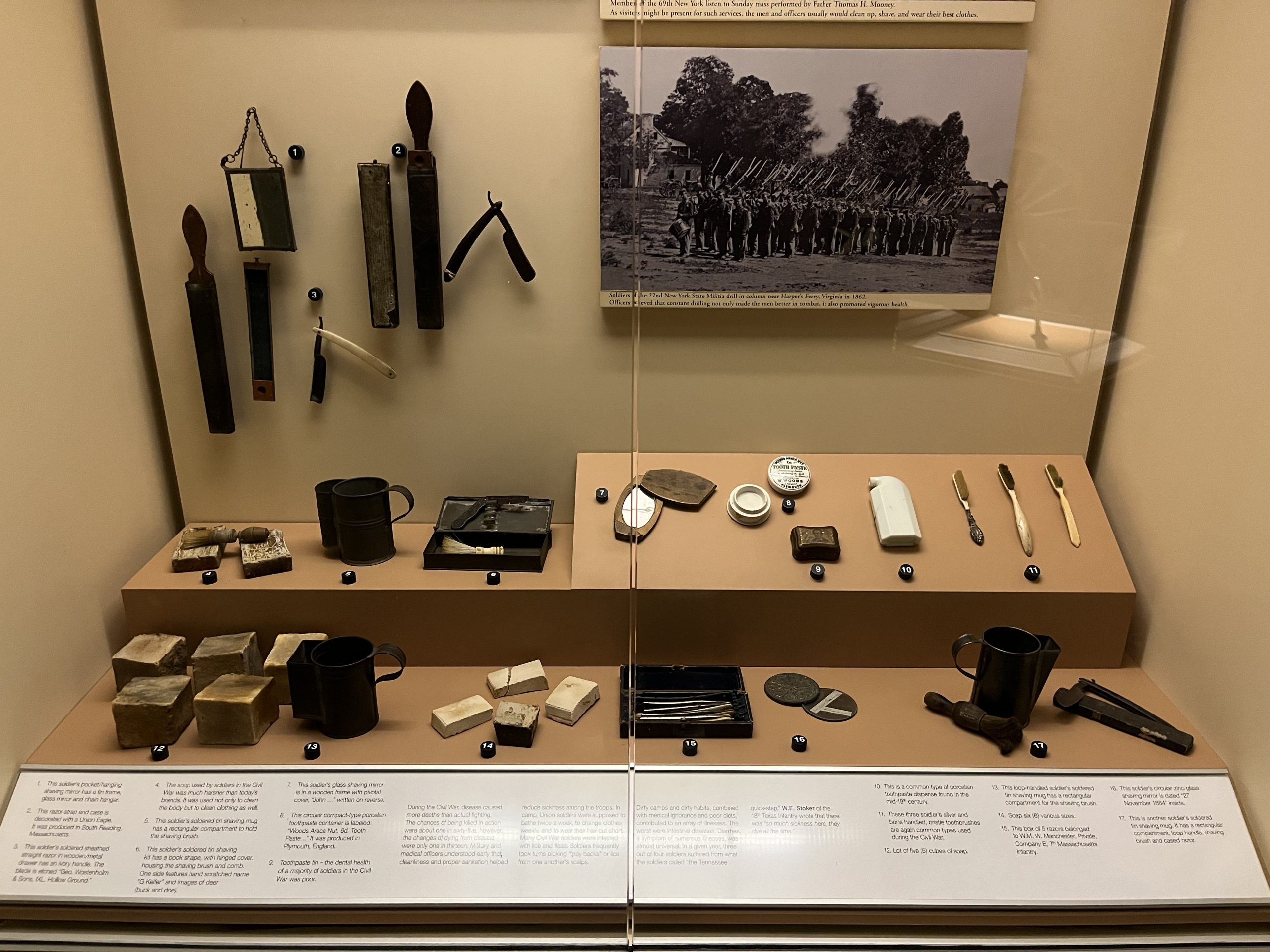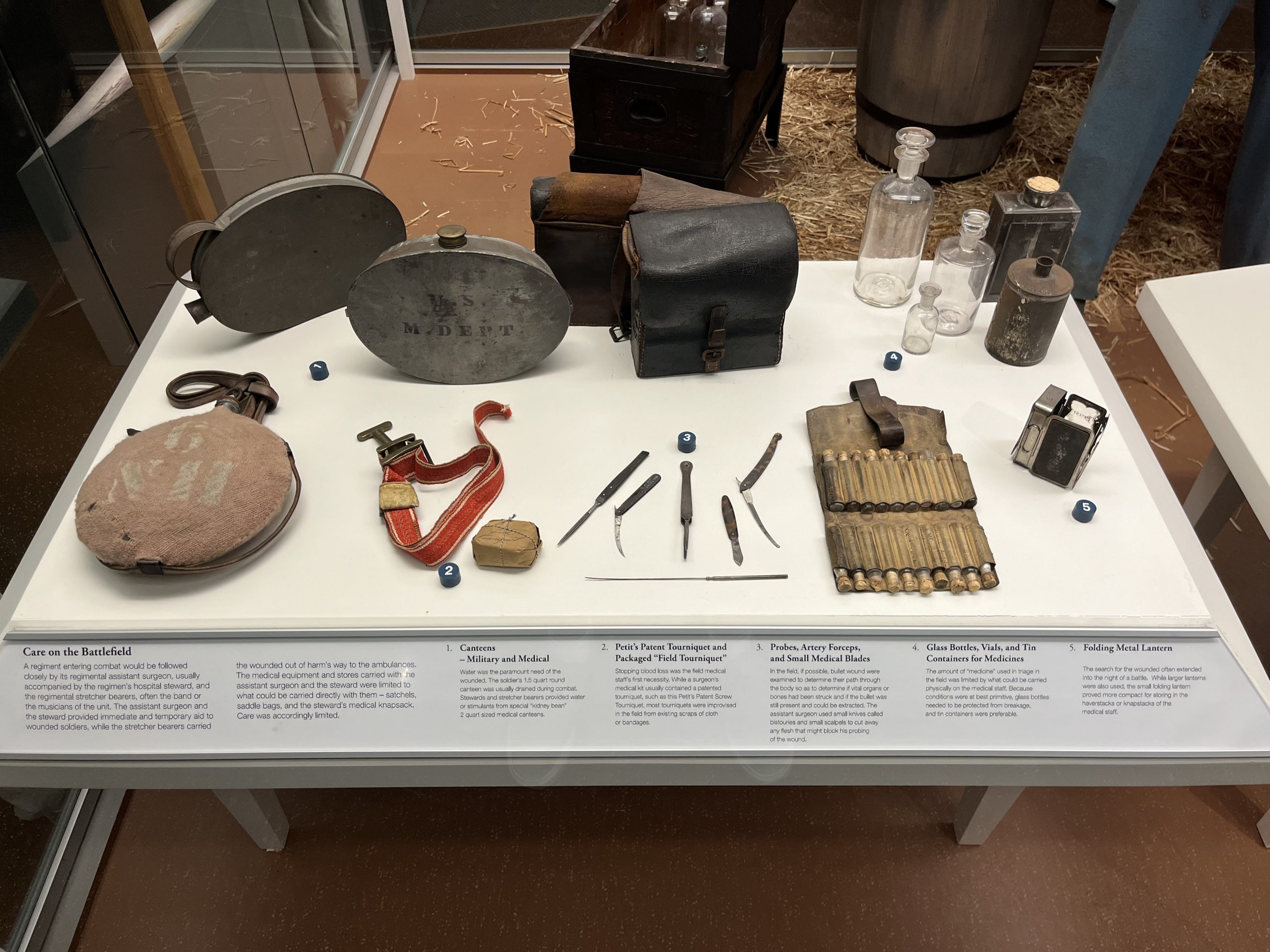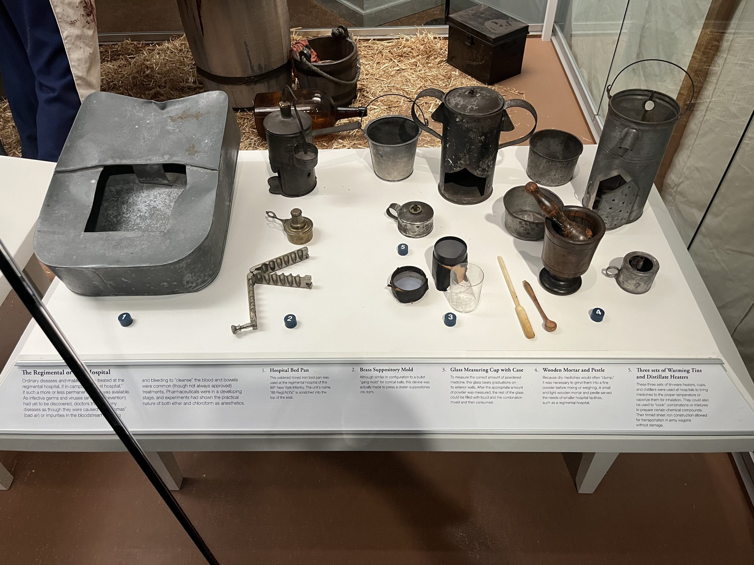 There are exhibits which do a phenomenal job of showing the uniforms and equipment of the various military branches of both the Union and Confederate forces: infantry, cavalry, artillery, and navy. Also, exemplary, in my opinion, are the exhibits presenting the state of medical care during the war. Lastly, there are a couple of photos towards the end of the gallery showing informational placards on the “War of Firsts”. Some of these I captured in photos of exhibits, but not all, so read through the placards in these two photos. They are extremely interesting – as in I didn’t know that!